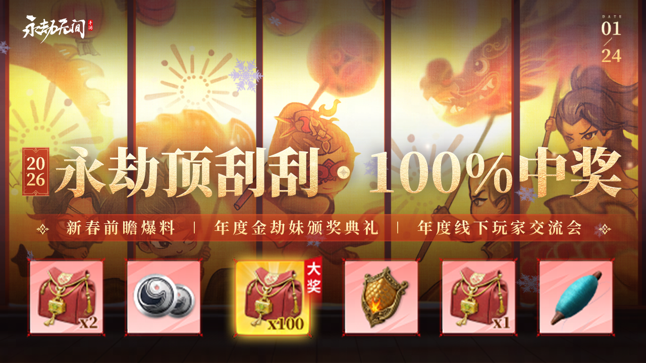 劫友集结,福利狂欢来袭!新春将至,专属宠粉福利正式解锁!“张灯结彩”专属刮刮乐100%中奖不亏,超级大奖、限定好礼拿到手软,更有聚宝之夜线下盛典+全平台直播重磅开启!这份诚意满满的新春福利,只为陪你热热闹闹迎新年!永劫顶刮刮送大礼啦!我们劫友也有属于自己的刮刮乐了!中奖概率100%!通过完成【每日任务】和【预约关注任务】来获得刮刮乐彩票,一日至多获得8张刮刮乐。只要参与就有机会开出最