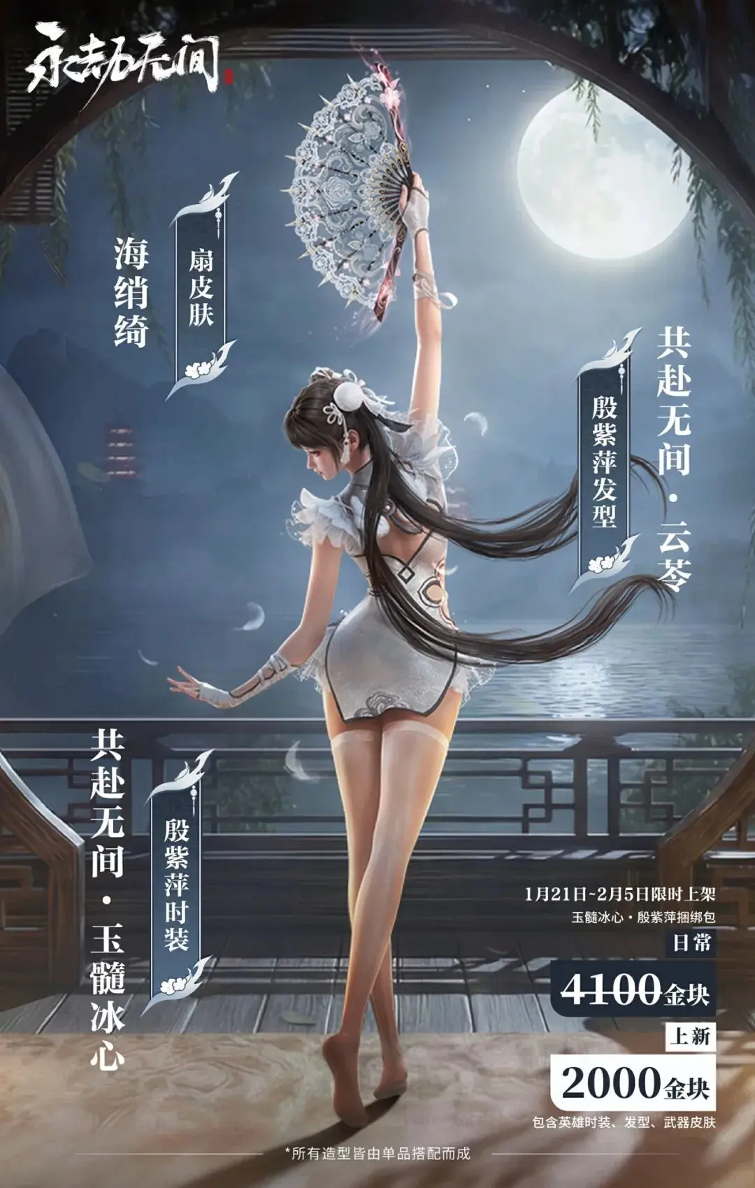 1月21日起,殷紫萍的【玉髓冰心】新皮肤要限时上架啦——双丸子头配改良旗袍,月光白锦缎绣着银灰梅花,肩头纱质花瓣肩饰随动作轻晃,又甜又飒的中华娘谁顶得住? 捆绑包直接打4.9折!含时装、双丸子头发型和扇皮肤【海绡绮】(淡青水纹超仙,据说还是鲛人织的~),原价4100金块,现在2000就能拿下,血赚! 商城还有配套彩蛋:展示背景和底座打折,通用动作【心动奇袭】是紫萍眨眼杀,萌到犯规;战利标记