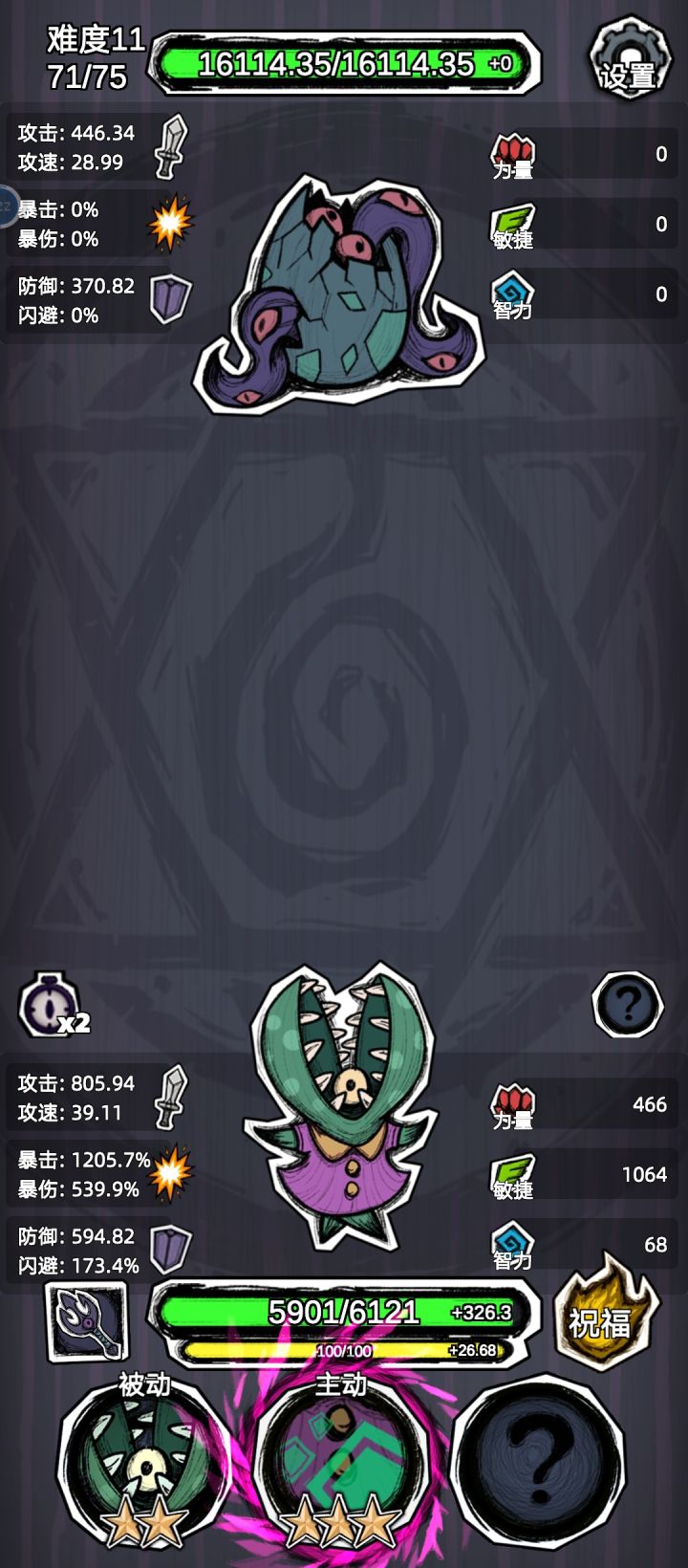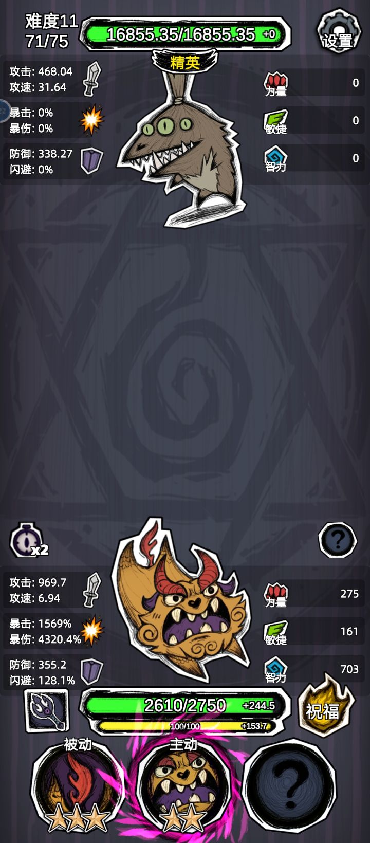 不是我说,我一开始死活过不去我以为是我太菜了,原来是作者就没考虑能通关的问题是吧,我翻了半天都只看见15左右的,还真就得我说的减攻回血血转攻防遇见低攻才出得去门啊,四个凹三个刷一次,这也太看运气了,这已经没有肉鸽的快乐了,硬凹啊