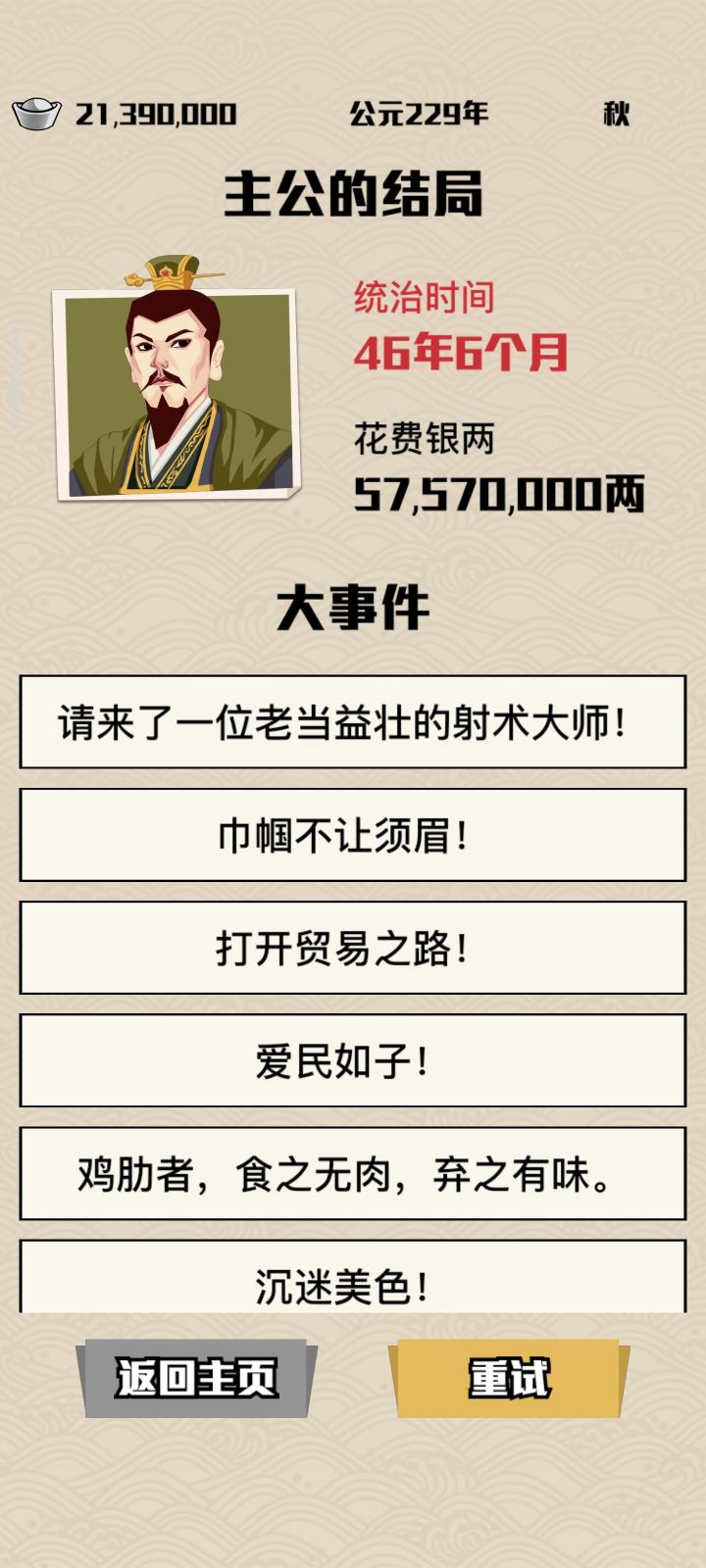 不足在于玩法重复度高,核心是“平衡势力→赚银两→应对事件”循环,60+回合后事件反复(女儿多次出嫁、谋士重复战死),后期仅数值堆砌无机制创新,长玩易腻 ;决策逻辑模糊,部分选项的势力好感增减不合常识,无明确因果提示,策略深度浅,更像“看脸刷好感”而非权谋博弈,新手易因莫名叛乱弃坑;数值与广告问题,国库收入依赖势力施舍,无稳定税收,前期易因“没钱维持统治”崩盘,复活/资源获取频繁弹窗广告,影响体验 ;三国联动弱,历史人物/战役多为背景板,难改变历史走向,角色交互少,缺乏武将招募/领地经营等传统三国玩法,沉浸感不足 。