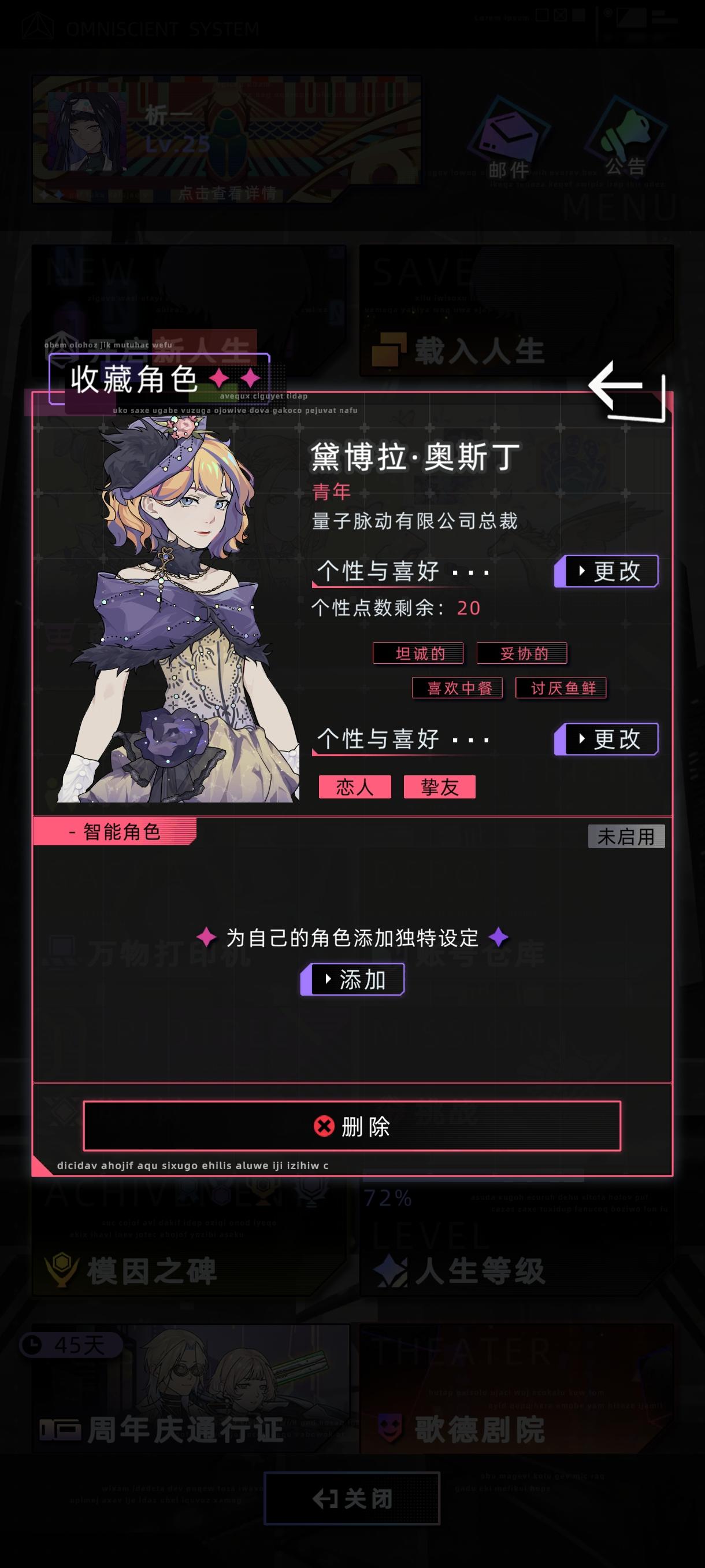还有那个有一个天妒英才的天赋,我之前为了刷经验就带那个,有一次为了好玩又搞了双生子,然后因为是传承的而且忘了给自己钱,并且小时候打不开财产界面,无法搬到正常房子住。导致俩人一直贫困的在外流浪。我好不容易成年了可以领取上一世的财产了,我拿回钱的时候第一时间就带我和妹妹搬出了停车场,终于离开了营养不良的生活。我的妹妹的ai一直很乖,而且很依赖我,因为是高级市民,我的升任很快,但到了25岁时,我还是得走,我真的当时特别舍不得我的妹妹,特别当我看到她小时候因为贫困被孤立只能学那个中等职业的学院,机械造物的好像。长大好不容易和姐姐过上了短暂的好日子,姐姐就走了…我感觉这个宿命感真的特别强。