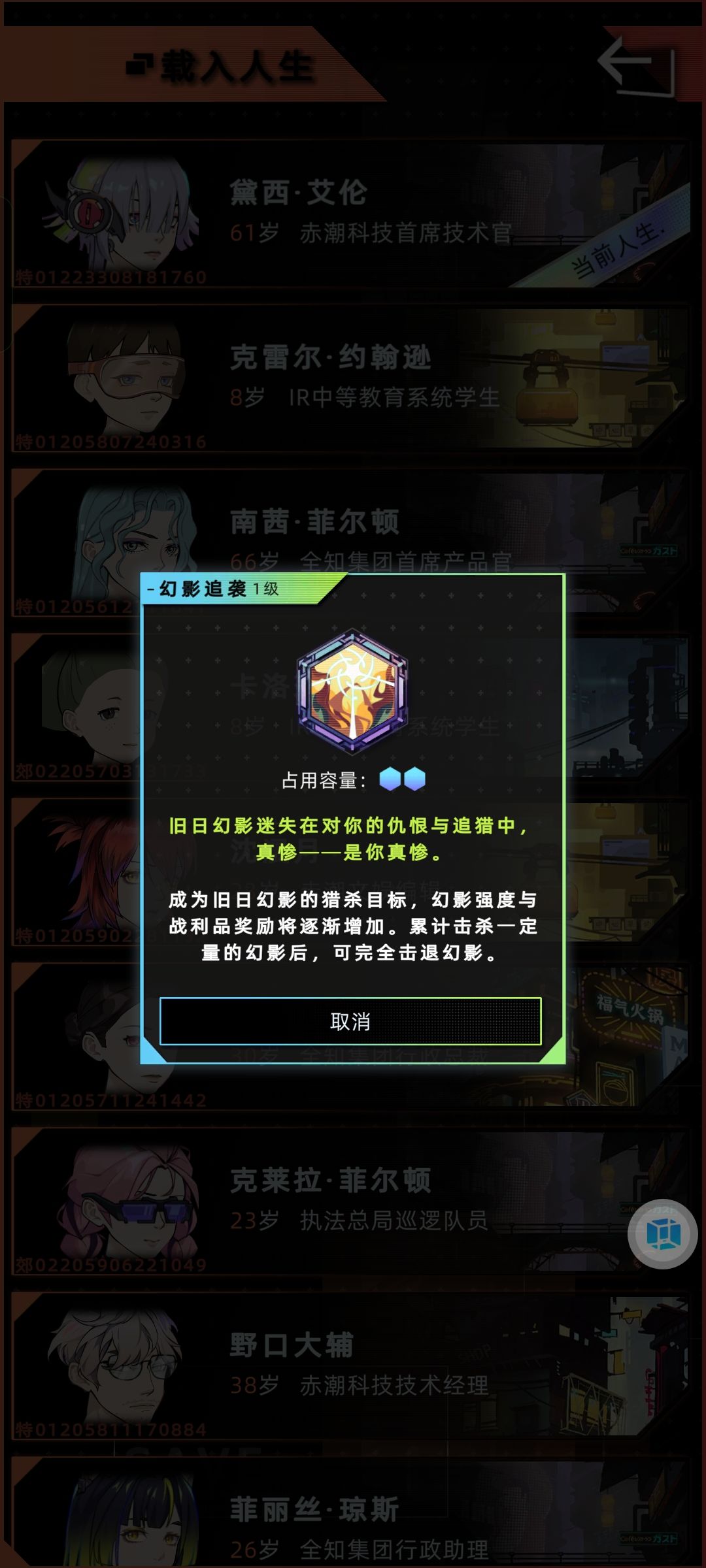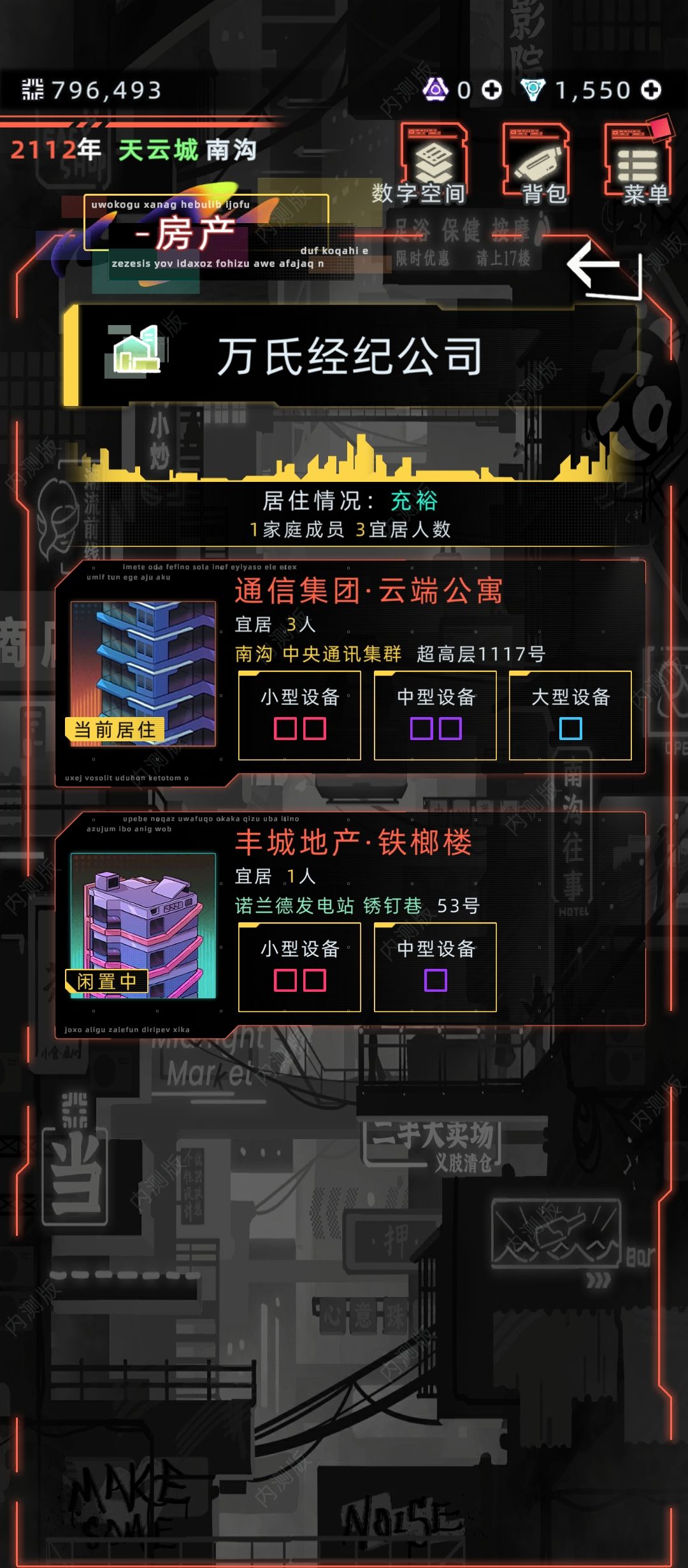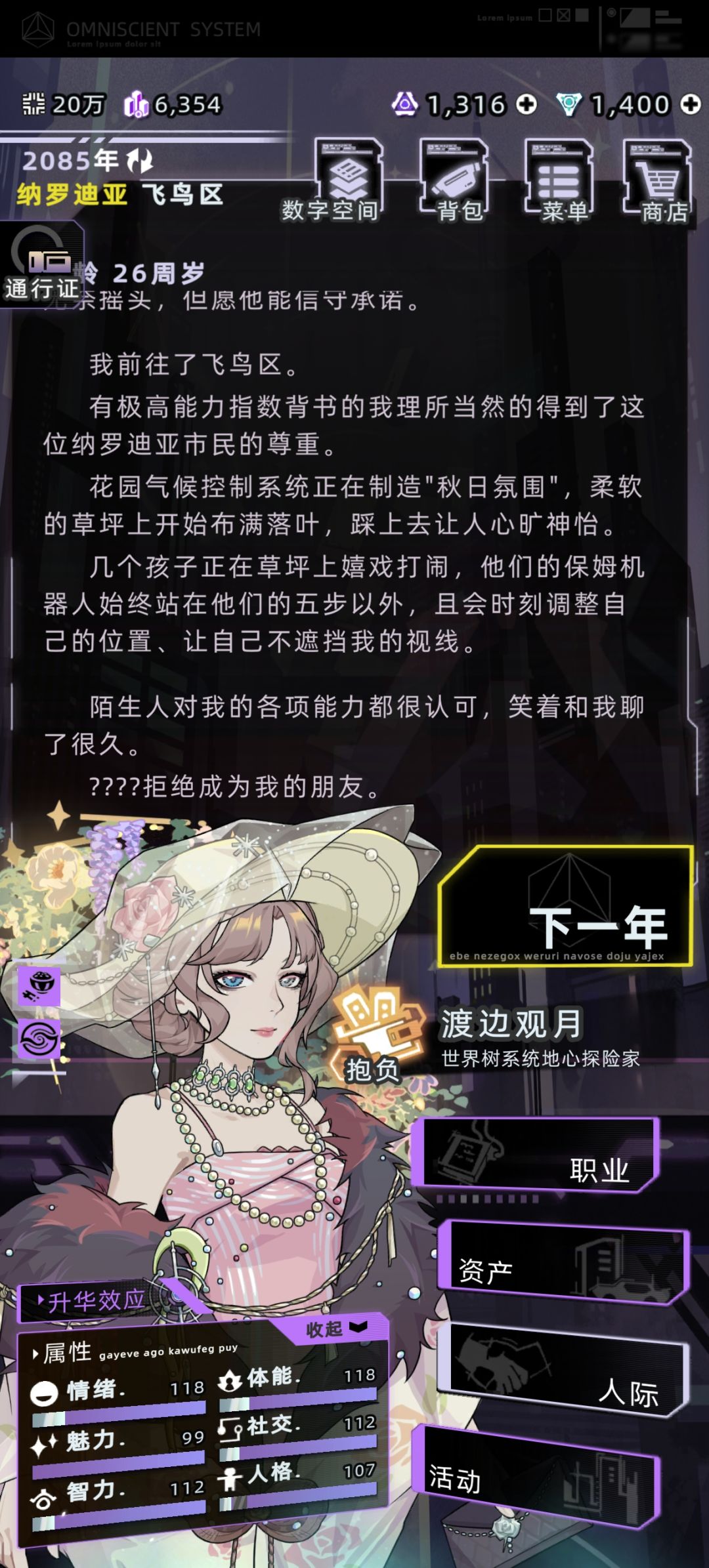 4岁 活动-中医院/医疗中心-诊所:中医院可以治愈慢性疾病(例如废弃大楼探险得的慢性肺炎),医疗中心可以一次性治愈重度焦虑症 6岁 暗巷-探险:是未成年时期主要的赚钱手段,其中废都-暗巷-废弃商业大楼-四楼,为收益较高的地点 零工-采菌:⚠️可能会死!同时零工赚的钱很少,不推荐做 地摊:可以购买增加体能/智力/情绪,降低压力的道具 地标广场:与陌生人聊天(加社交) 8岁 商场:全息影院-数字骇客(
