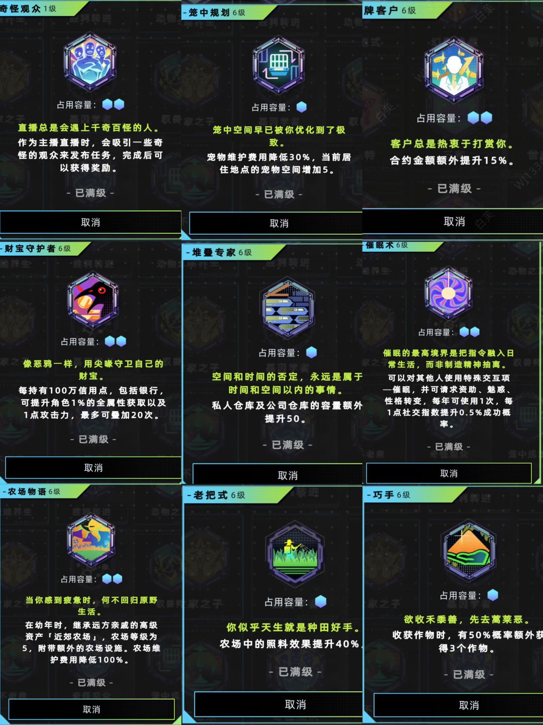 #未来人生 #未来人生农场攻略 奇怪观众,礼包天赋,纯粹增加点小剧情以及些许收益,不太值得氪金的天赋。 笼中规划,卡池天赋,升满配合新的感性枝丫在开荒阶段赚钱很快,也降低了sl次数,推荐养猫。 金牌客户,豪华通行证天赋,凑数天赋。 财宝守护者,鸦礼包天赋,稀有的加攻击天赋,热爱战斗可入。 堆叠专家,豪华通行证天赋,开荒农场很有用,因为初始仓库太小了。 催眠术,卡池天赋,有个邪恶的名字,用来子女催