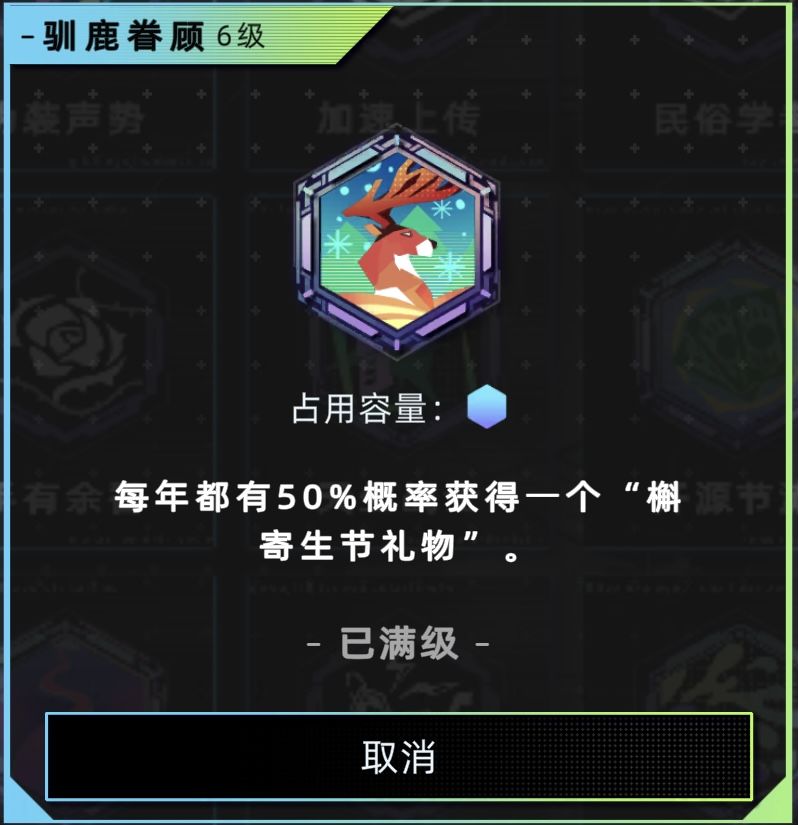 驯鹿眷顾:礼包天赋,一格天赋,据说是获得礼物(包括车房,有看见开出来红龙的) 丘比特:卡池天赋,一格天赋,折磨大家许久的拉郎成就解锁终于有了天赋助攻,但除此之外好像没什么用了 天下一拳:二格天赋,与刀之灵还有天生战士犯冲,适合被好友加入世界打架 极端养生:两格天赋,适合没有抽到寿命枝丫玩家获得百年天赋,但是不能在外面吃饭吃零食,适合传代档,不适合开局档。 胜利转进:一格天赋,绝对是在开运输大队长玩