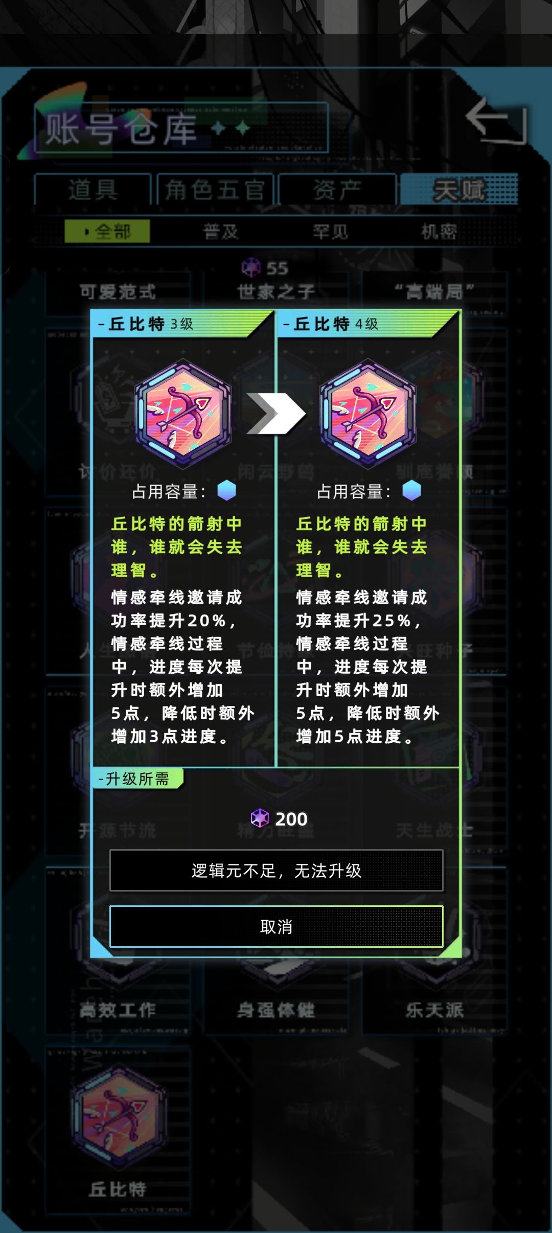 感谢指正,有问题请在评论区留言,会尽快修改❗已经有老师给出了伙伴攻略与武器攻略,以下是一部分个人思路,仅供参考 首先天赋分为三种,一种是二卡槽天赋,另一种是一卡槽天赋,还有一种三卡槽我忘打了。而初始的卡槽只有三个,氪金可以让卡槽变成六个,因此搭配因人而异。其次,越稀有的天赋升级越耗费逻辑元,尽量留着升有用的,也有初始满阶天赋 ✍🏻个人理解:能用信用点解决的(食品 电影 餐厅 中医院 肌肉激活 全知