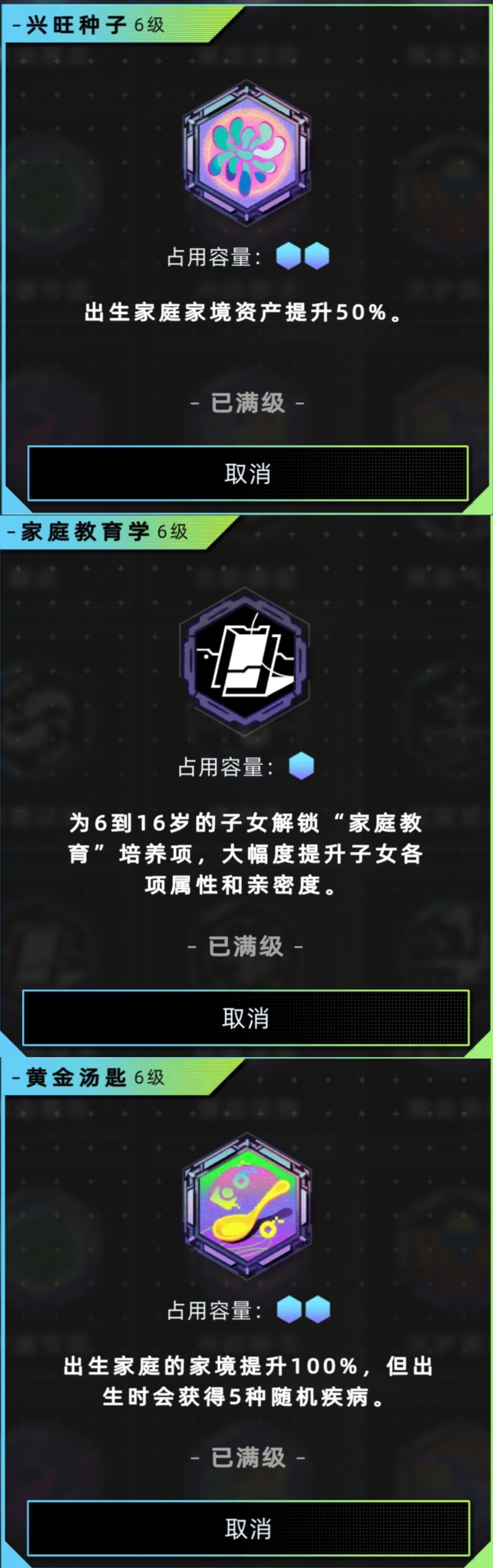 首先声明,天赋不全,身强体健,闲云野鹤是群友给我分享的图,万分感谢。若是有人有其他满级图希望发一下。二三链接附在最后 闲云野鹤没有用,升满减压百分百但只限这个职业,工资少,还在人生奖励后面,甚至是二格 第三第四张图,我愿称之为一格天赋中的格子有空都不愿意带 双生,商城购买天赋,可能双生子是好多人喜爱的属性,可在未来人生中并没有特殊剧情,起码我没有触发过。兄弟姐妹唯一作用是你家族谱里面的旁枝还有分爸