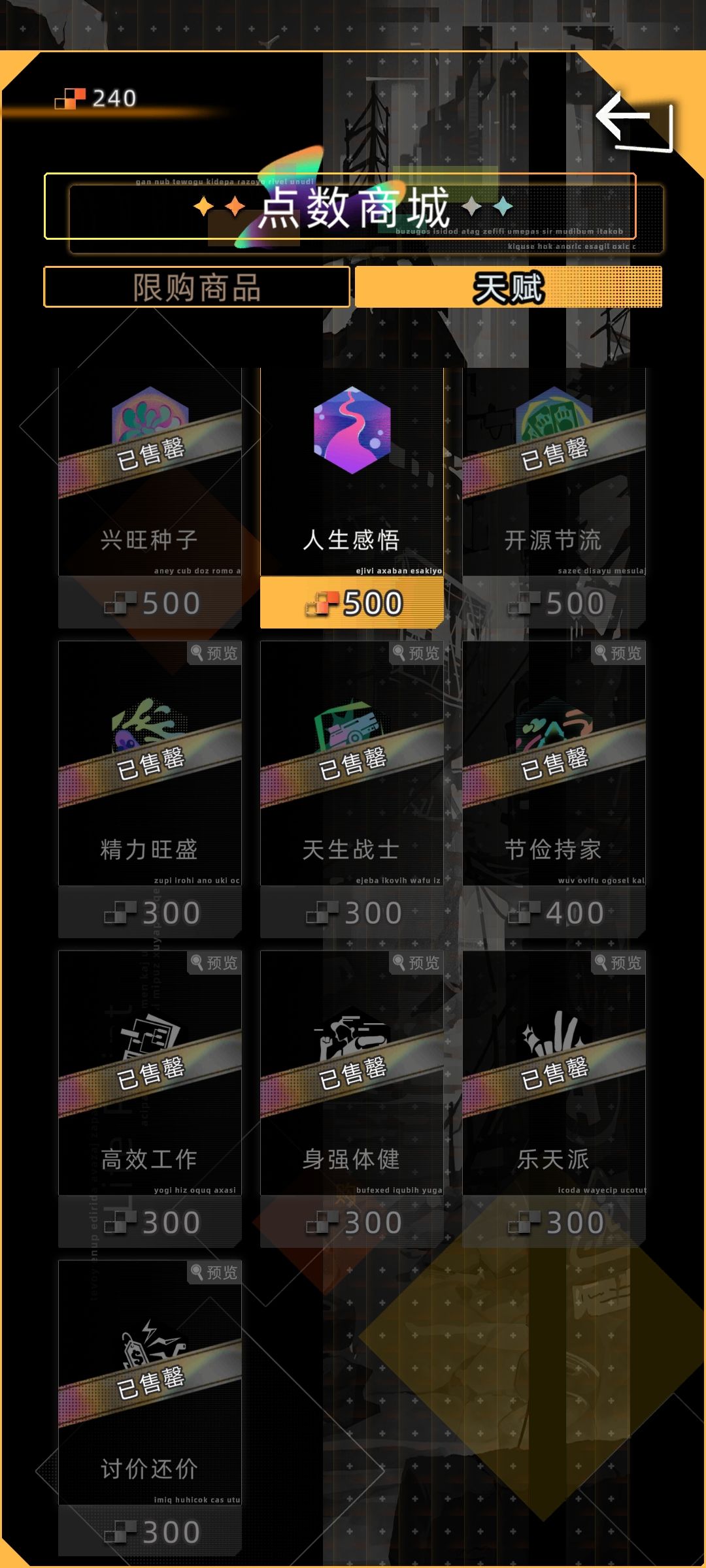 ♥在游戏中天赋加成对游戏还是可以降低不少难度,这里分享一下天赋的几个主要获取途径。♥ 1. 抱负进入点数商城,用点数兑换(这里商城里功十个天赋,共需消耗点数3700) 2.商城里天赋栏目直接购买(共有天赋9个,需消耗珂金5400) 3.人生登记解锁获取(共有三个天赋) 4.万物打印机抽奖获取(包含天赋27个,获取看欧非程度,玄不救非氪不改命) ♥以上为全部天赋获取途径,总计49个天赋♥后续