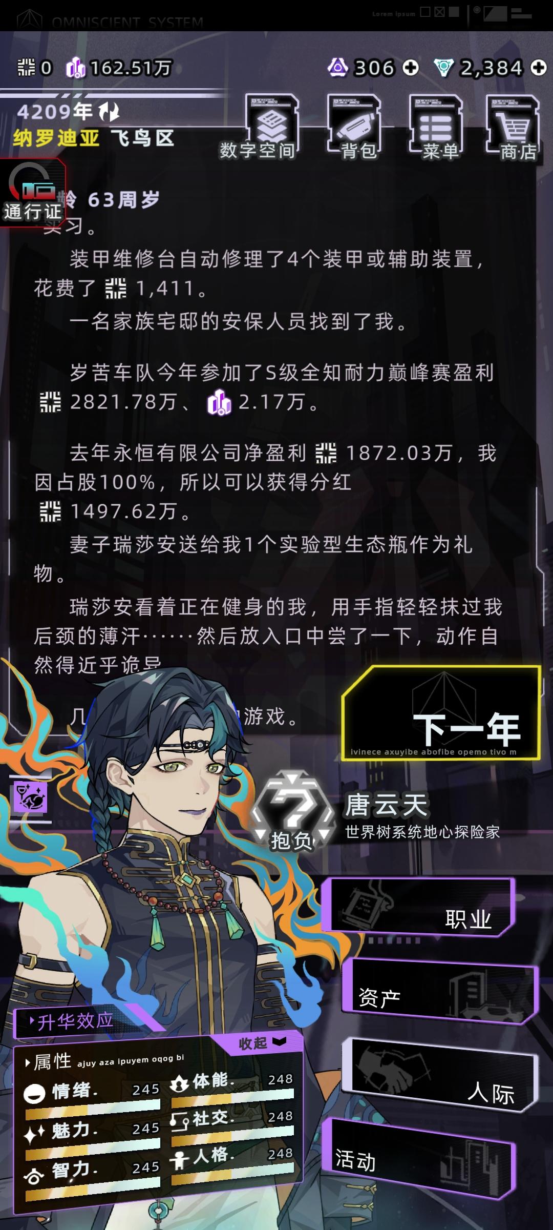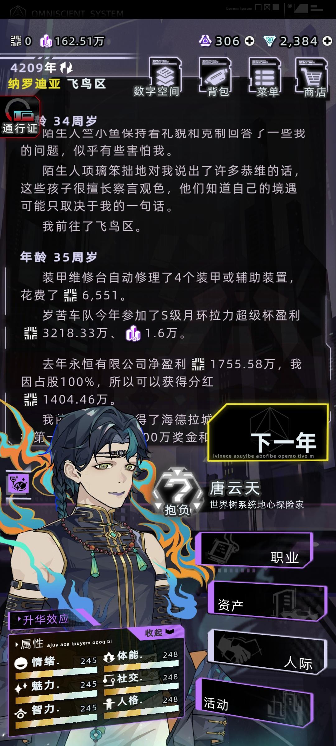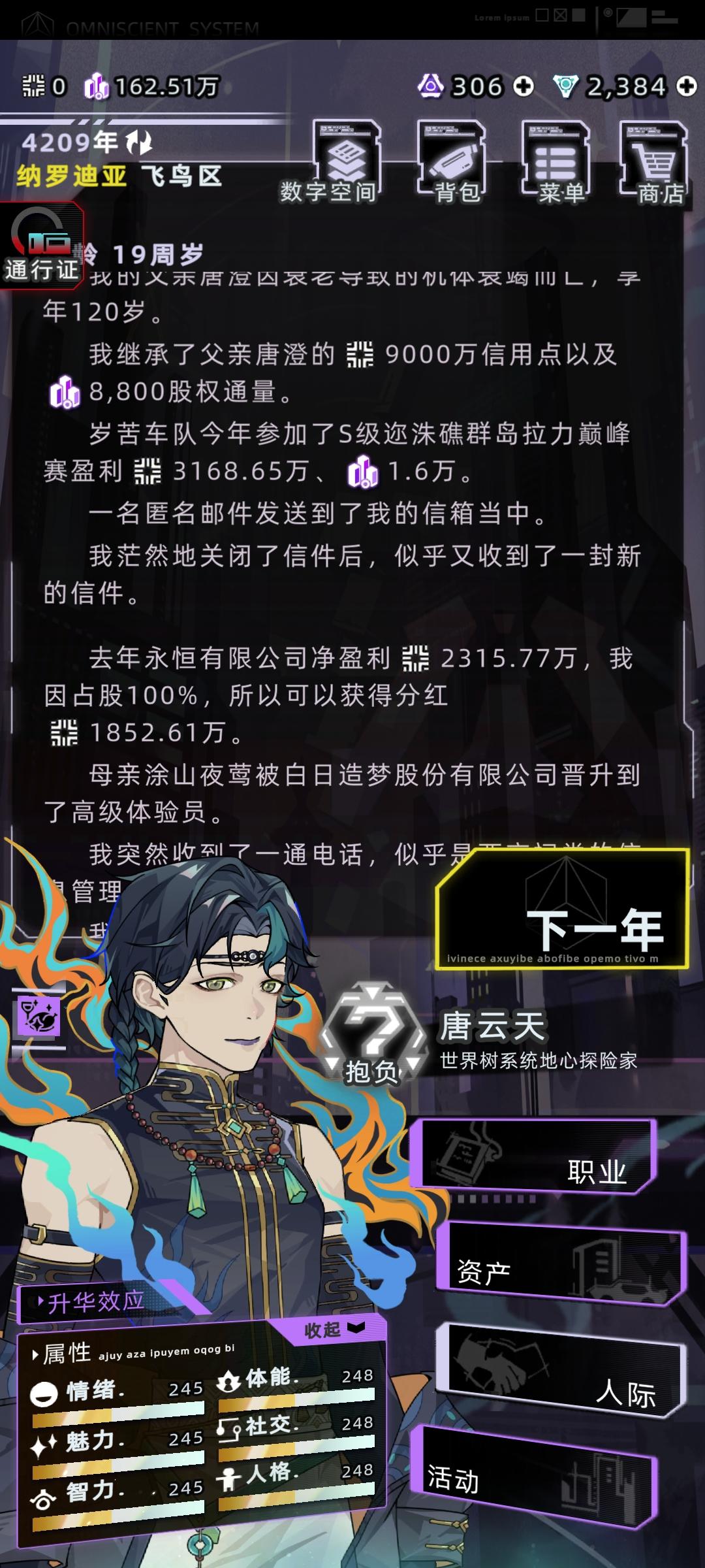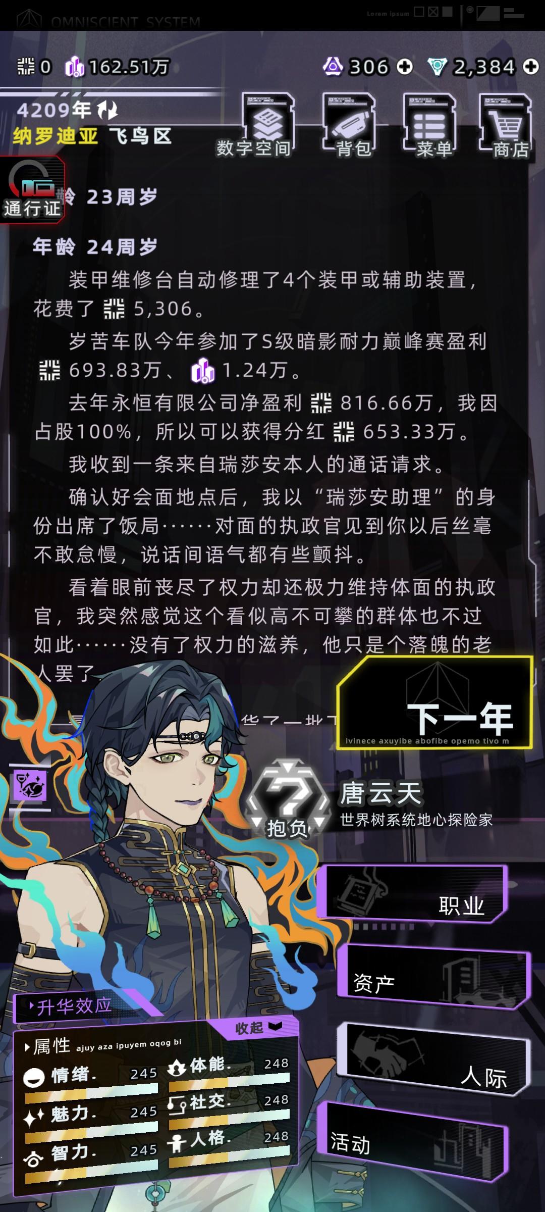 感觉之前那个攻略有点智障了,又优化了一下首先直接开始下一年,学习,学数字空间开发,结束中级学业,开始工作选项主要点理解力和熟练度,有点钱可以在资产设备中型买一个便携式工作站和全知辅助装置买一个脸部加熟练度的和颈部加理解力的,算法改进不用认真全消,改进先把可维护加到90,后面全加速度,这样每年都有不低的收入,在这个过程中可以收养一个孩子,他8岁带他去看数字骇客,只要有就看,保证在你死