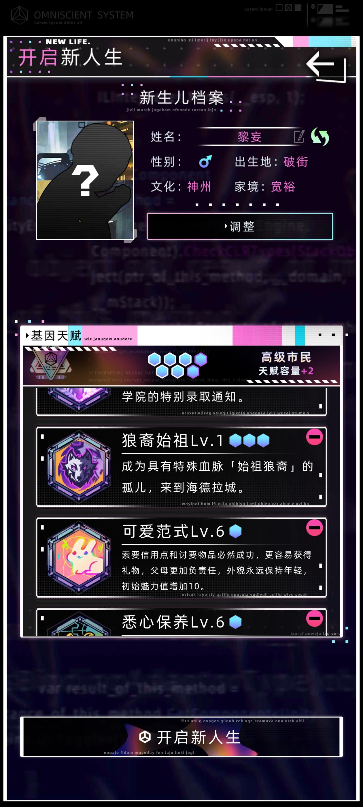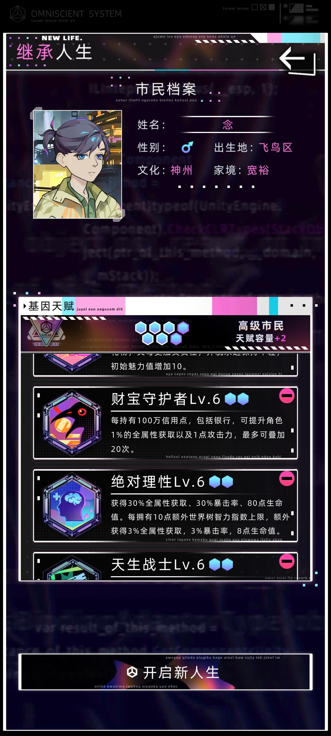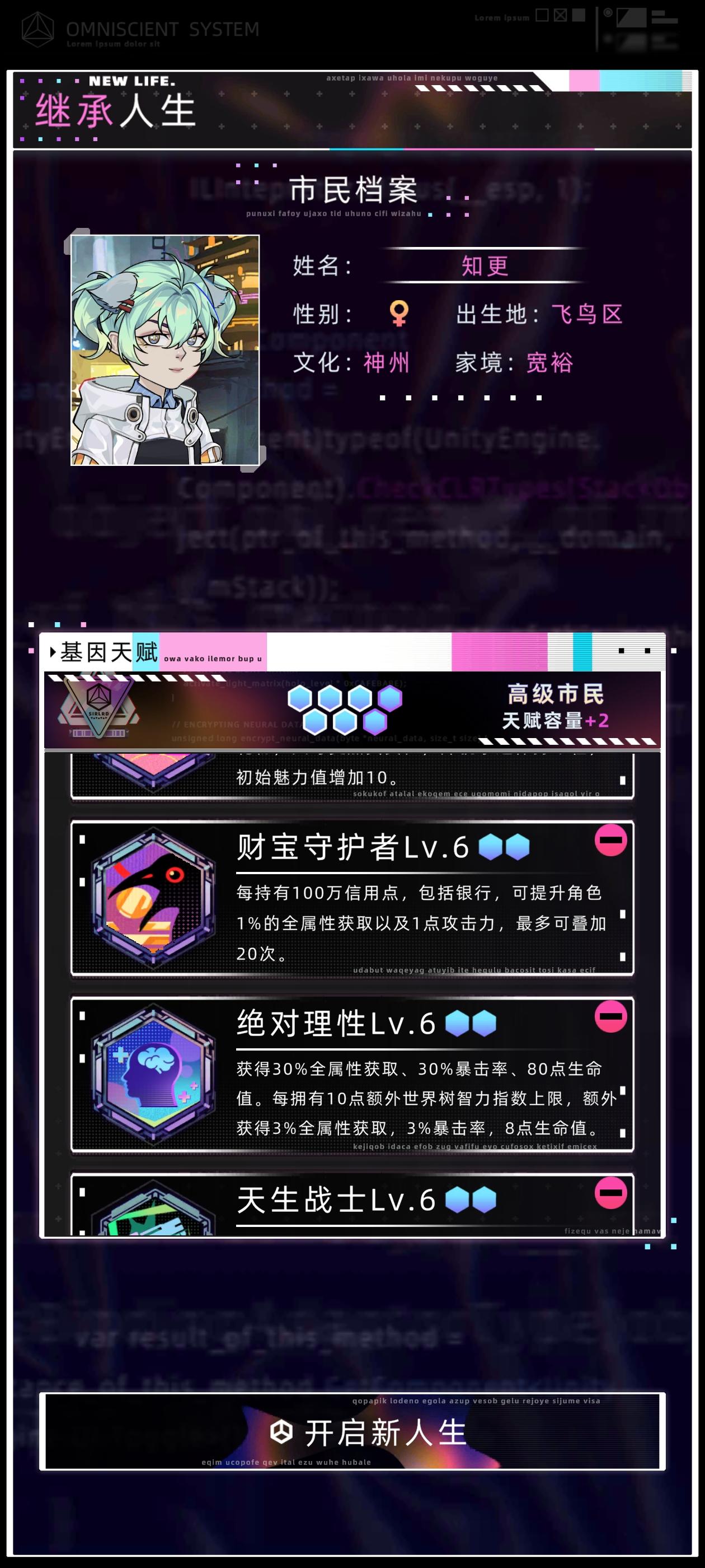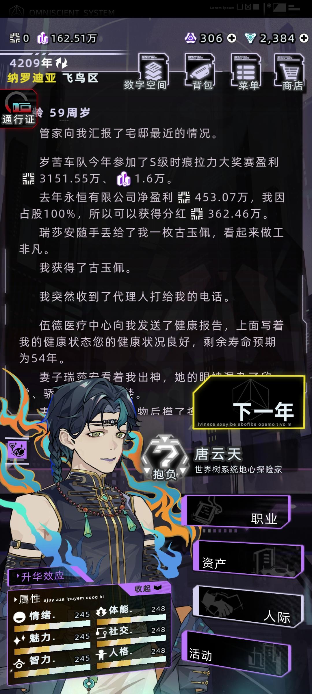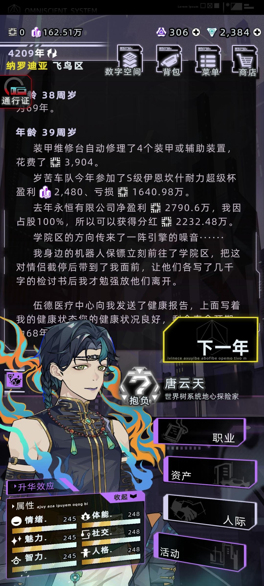 感觉之前那个攻略有点智障了,又优化了一下首先直接开始下一年,学习,学数字空间开发,结束中级学业,开始工作选项主要点理解力和熟练度,有点钱可以在资产设备中型买一个便携式工作站和全知辅助装置买一个脸部加熟练度的和颈部加理解力的,算法改进不用认真全消,改进先把可维护加到90,后面全加速度,这样每年都有不低的收入,在这个过程中可以收养一个孩子,他8岁带他去看数字骇客,只要有就看,保证在你死
