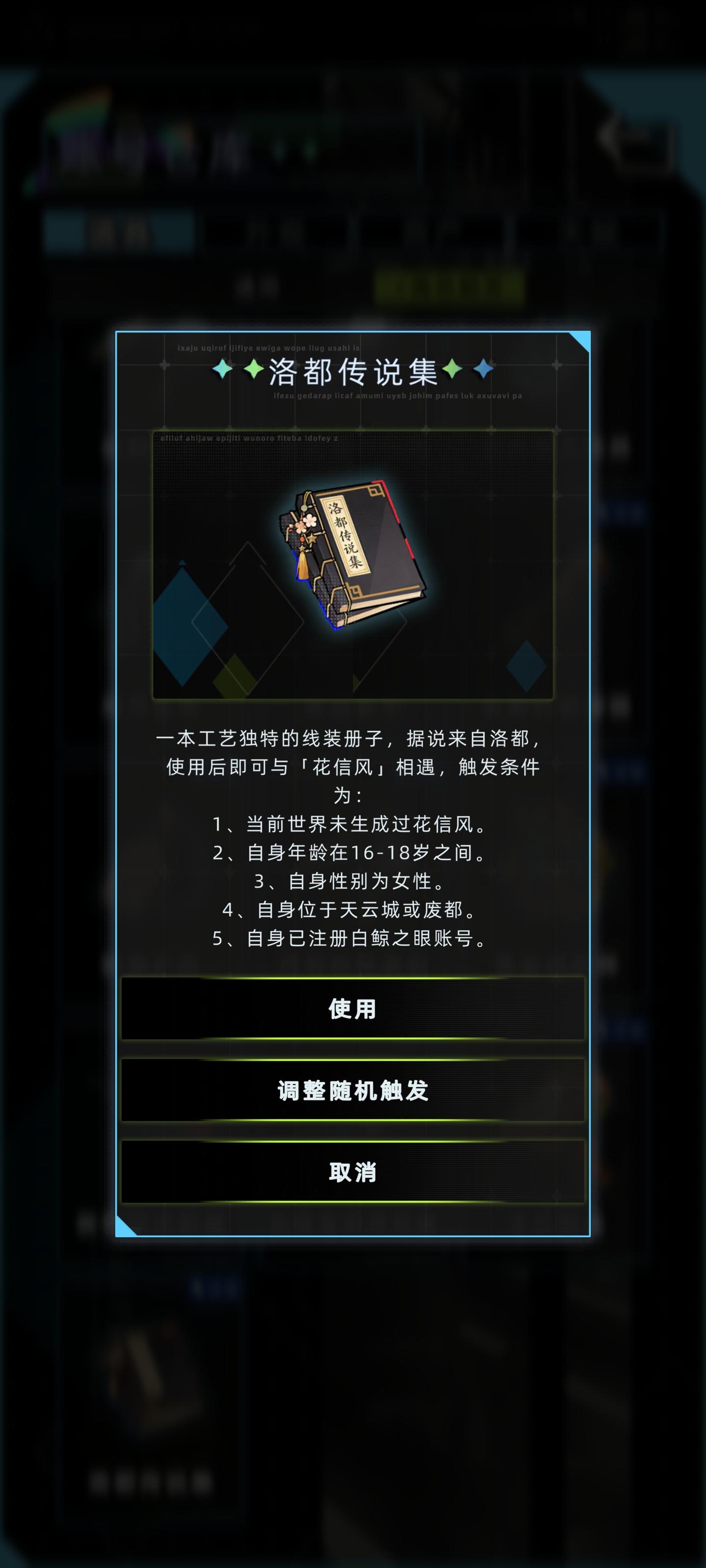 新增特殊角色:伽一(可攻略) 、花信风(可攻略)1.伽一触发条件(如图一): ①未触发过该角色及其他角色 ②需角色性别为男③角色处于15-20岁时自动触发④处于天云城或废都(处于下城区) 注意事项: 1.该角色剧情未存在其他分支,注意不选错选项,剩下的随意选 2.该角色在触发剧情后的第三年才会触发选项剧情(总结就是,不无视她就可以了,如图三、图四) 2.花信风触发条件(如图