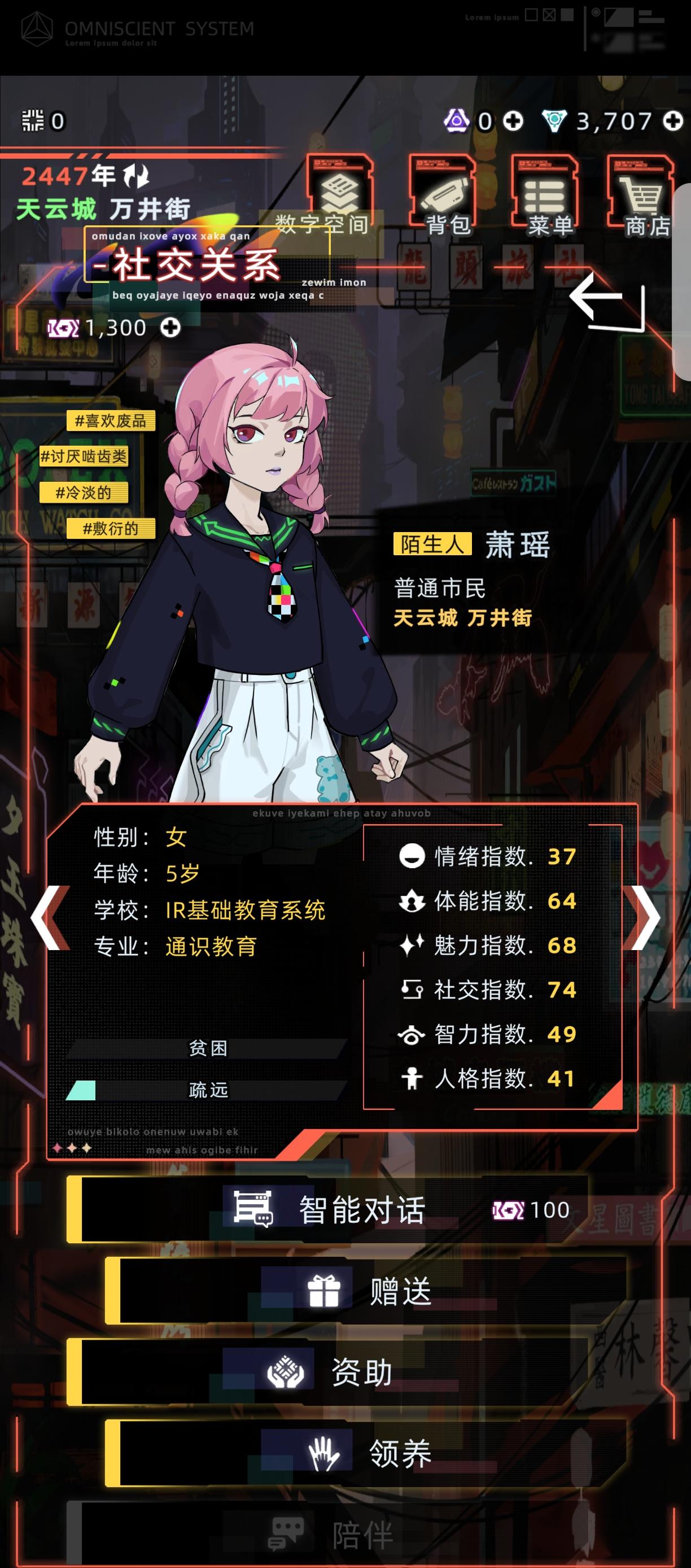 感觉之前那个攻略有点智障了,又优化了一下首先直接开始下一年,学习,学数字空间开发,结束中级学业,开始工作选项主要点理解力和熟练度,有点钱可以在资产设备中型买一个便携式工作站和全知辅助装置买一个脸部加熟练度的和颈部加理解力的,算法改进不用认真全消,改进先把可维护加到90,后面全加速度,这样每年都有不低的收入,在这个过程中可以收养一个孩子,他8岁带他去看数字骇客,只要有就看,保证在你死