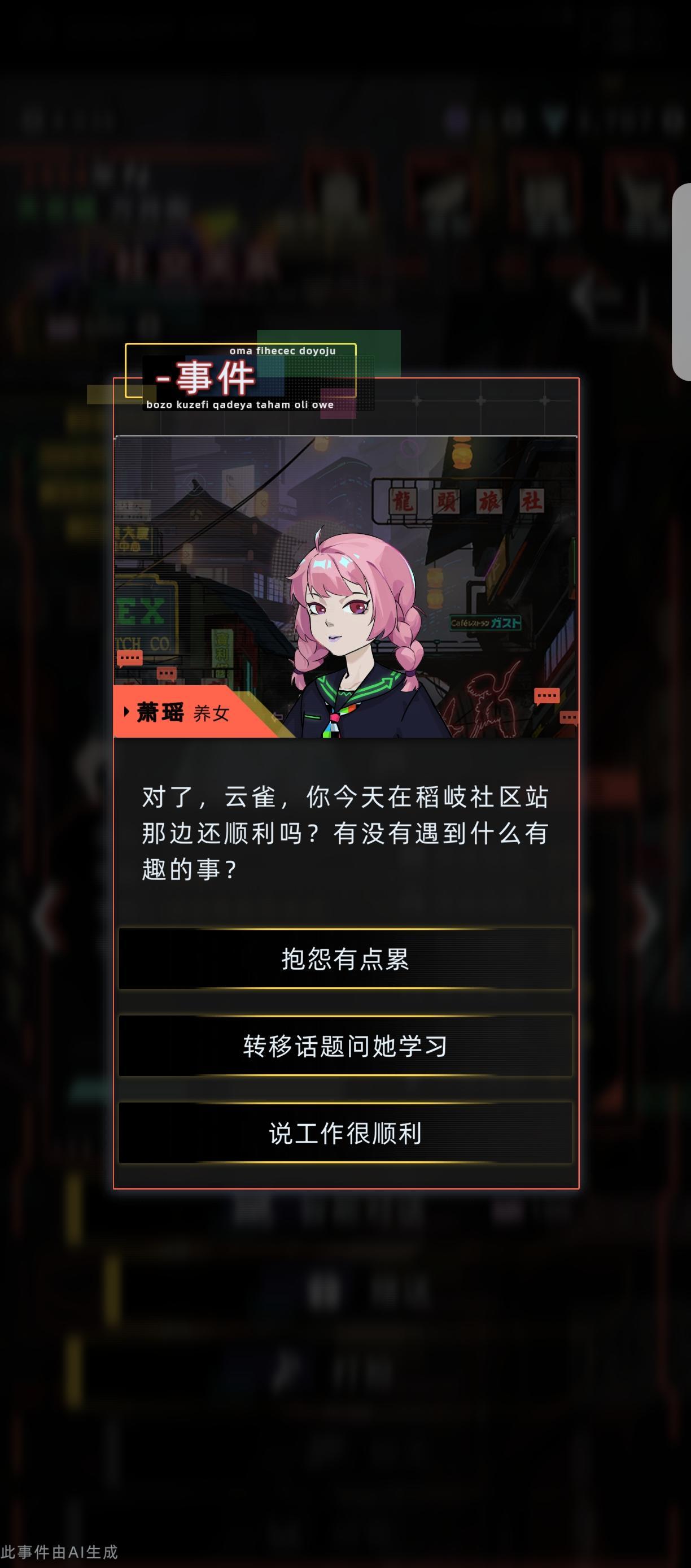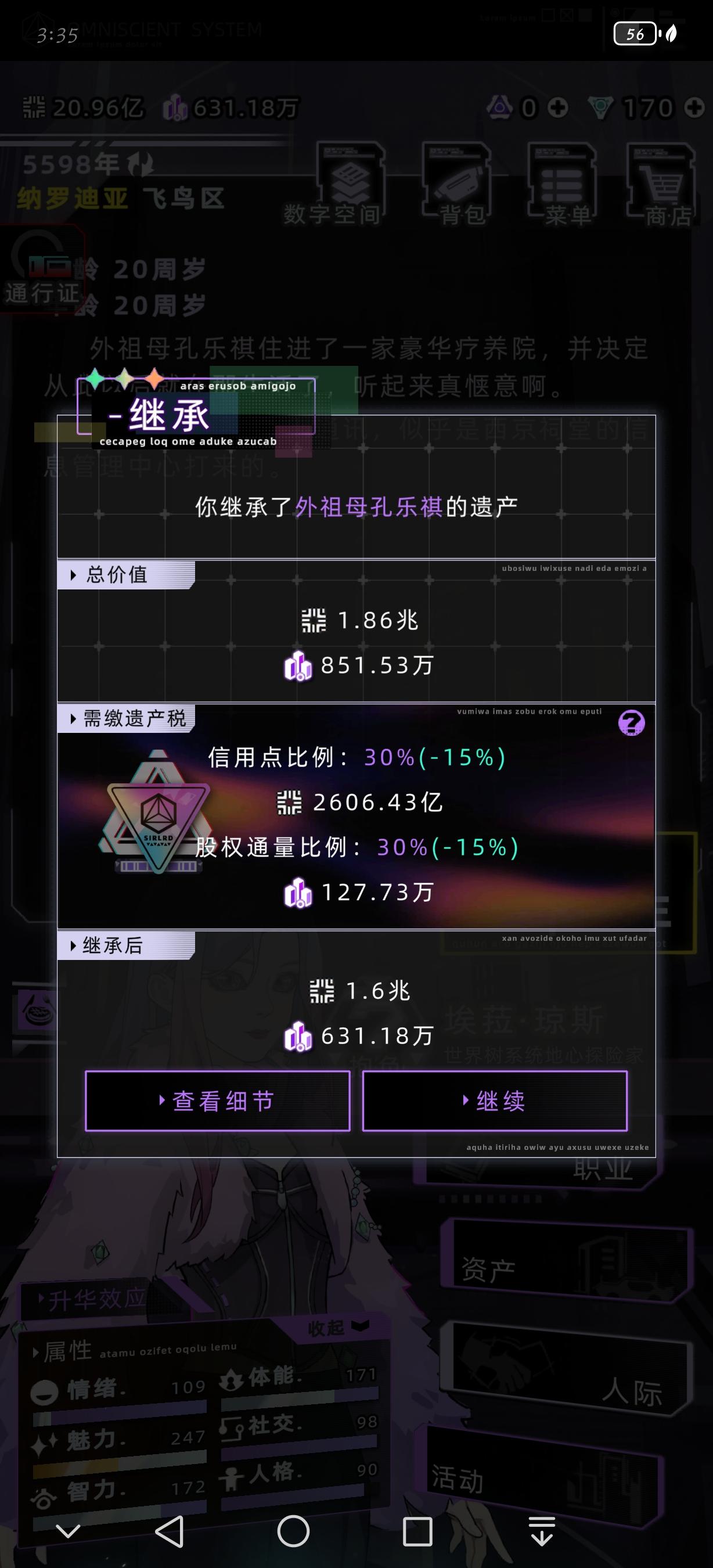 感觉之前那个攻略有点智障了,又优化了一下首先直接开始下一年,学习,学数字空间开发,结束中级学业,开始工作选项主要点理解力和熟练度,有点钱可以在资产设备中型买一个便携式工作站和全知辅助装置买一个脸部加熟练度的和颈部加理解力的,算法改进不用认真全消,改进先把可维护加到90,后面全加速度,这样每年都有不低的收入,在这个过程中可以收养一个孩子,他8岁带他去看数字骇客,只要有就看,保证在你死