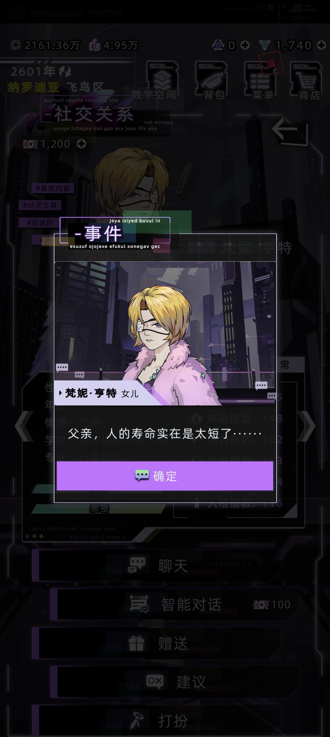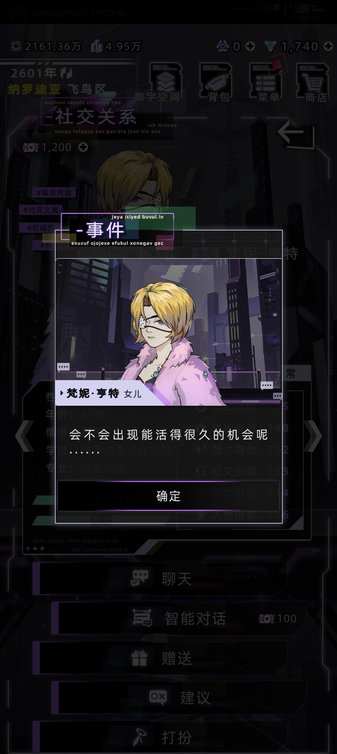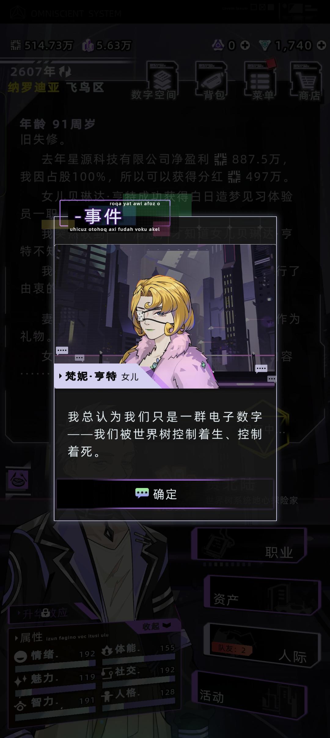 感觉之前那个攻略有点智障了,又优化了一下首先直接开始下一年,学习,学数字空间开发,结束中级学业,开始工作选项主要点理解力和熟练度,有点钱可以在资产设备中型买一个便携式工作站和全知辅助装置买一个脸部加熟练度的和颈部加理解力的,算法改进不用认真全消,改进先把可维护加到90,后面全加速度,这样每年都有不低的收入,在这个过程中可以收养一个孩子,他8岁带他去看数字骇客,只要有就看,保证在你死