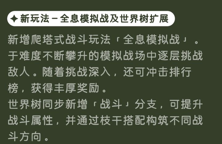 新职业—织梦师你是否也有一些执念?那些美好的、念念不忘的,或是迟迟无法言说的…… 就读纳罗迪亚研究学院「意识工程学」,成为一名织梦师——以编织之梦回应委托,在一次次潜入与回响中,拾起那些散落的情感碎片。新玩法—全息模拟战及世界树扩展新增爬塔式战斗玩法「全息模拟战」。于难度不断攀升的模拟战场中逐层挑战敌人。随着挑战深入,还可冲击排行榜,获得丰厚奖励。世界树同步新增「战斗」分支,可提升战斗