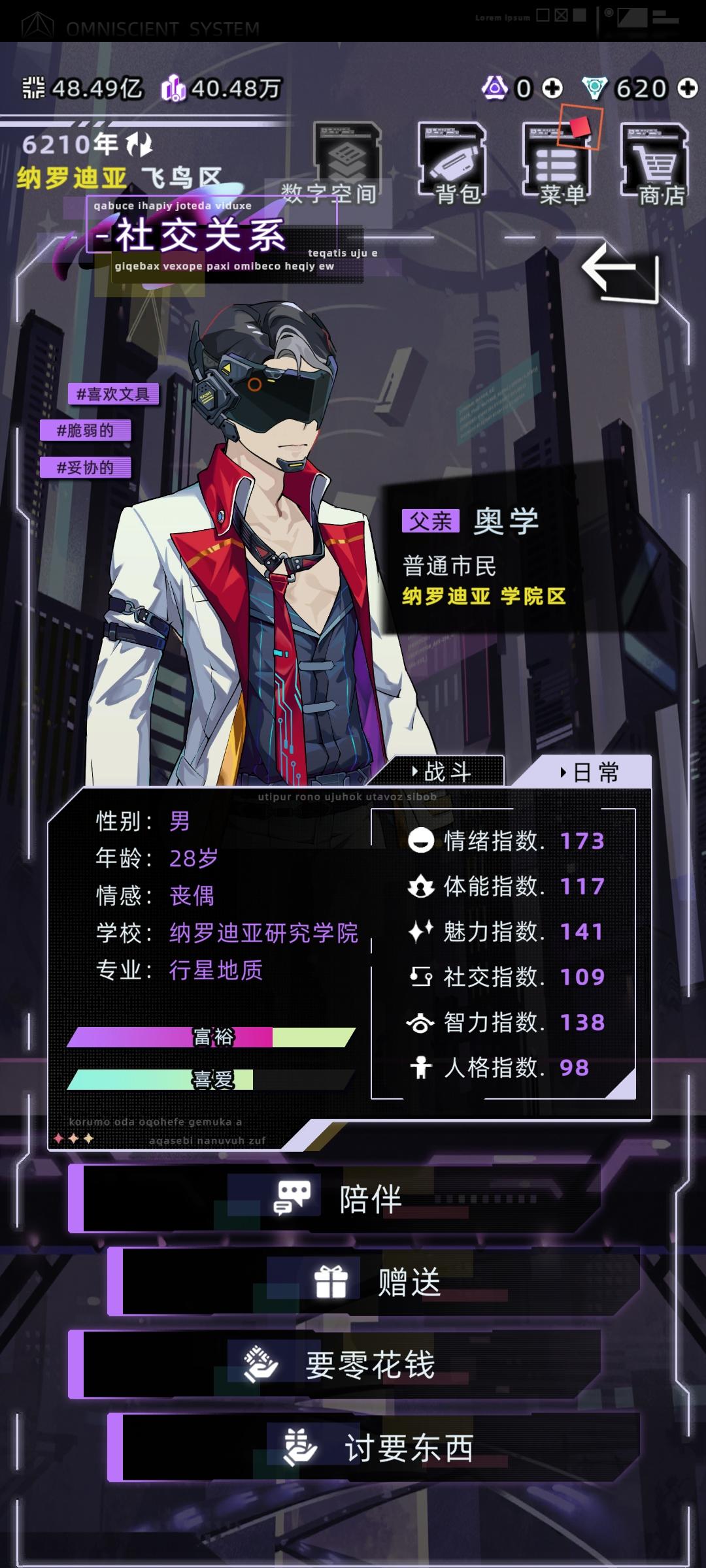 感觉之前那个攻略有点智障了,又优化了一下首先直接开始下一年,学习,学数字空间开发,结束中级学业,开始工作选项主要点理解力和熟练度,有点钱可以在资产设备中型买一个便携式工作站和全知辅助装置买一个脸部加熟练度的和颈部加理解力的,算法改进不用认真全消,改进先把可维护加到90,后面全加速度,这样每年都有不低的收入,在这个过程中可以收养一个孩子,他8岁带他去看数字骇客,只要有就看,保证在你死