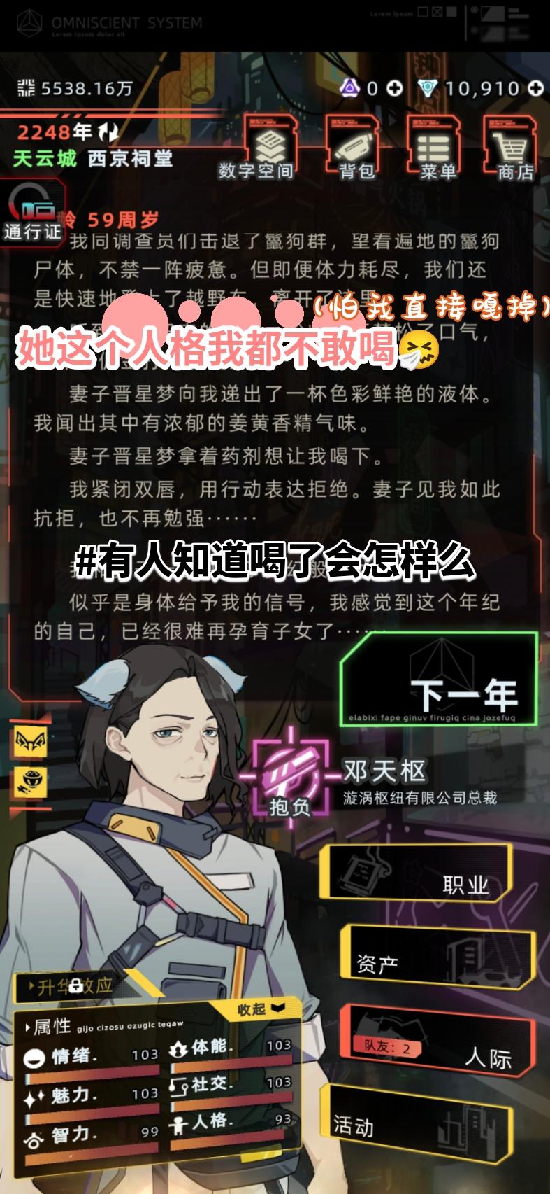 早虚 🤫怕死 的我遇到人格低的第二任妻子,给我药剂我都不敢喝话说我怎么这么早就不能生孩子了啊之前不都六十几才这样么,这一档提前了10年。ps:妻子刚娶回来的时候人格是个位数,年年跟她看电影补上来了一点,发现这个数值好像也没影响就没管了(有人知道人格低会影响什么么)#未来人生 #游戏日常 #发现好游戏