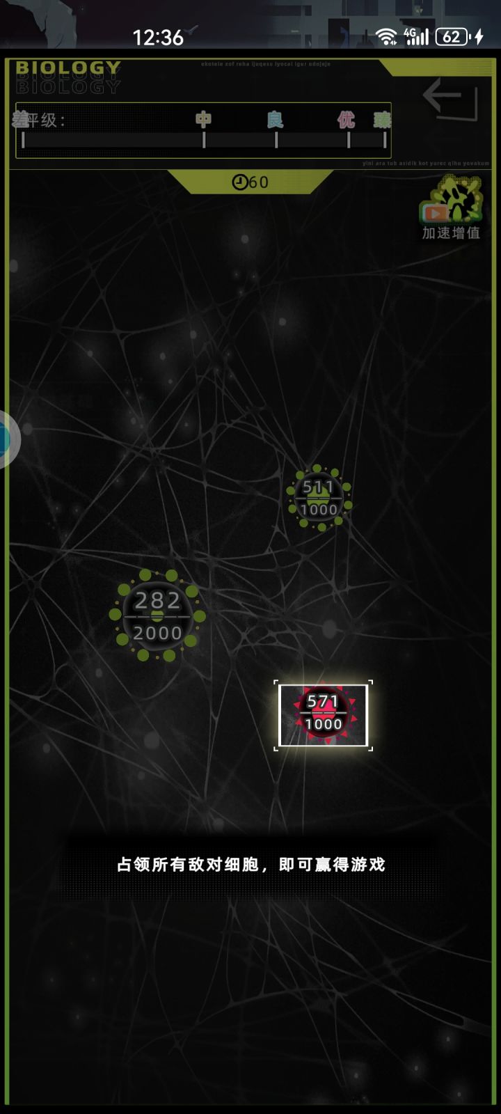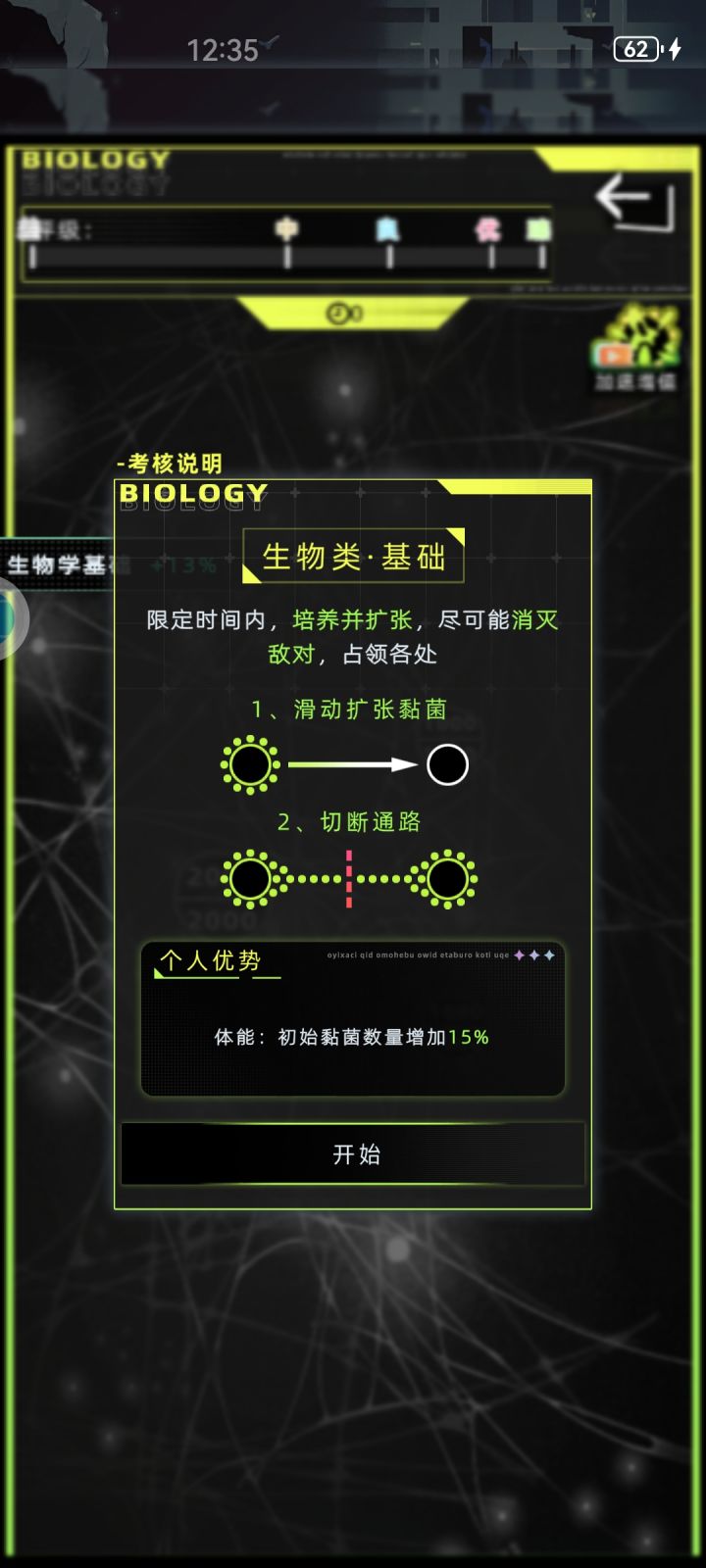 前言:考试会根据你的属性给加成(优势),目前我发现可获得加成的属性有体能智力和心情1.生物类基础考试(有时限,很简单!有进阶)阵营介绍:绿色的是己方(自己),灰色的是没被占领的空白粘菌,其他颜色的一律为敌方按住己方粘菌并拖动至空白粘菌上可开始占领,占领完成后空白粘菌会变为己方粘菌(记住占领后要切断通路!!)粘菌中间有两个数字,上面的是现有能量,下面的是能量上限,能量就是粘菌的战斗力,可以可