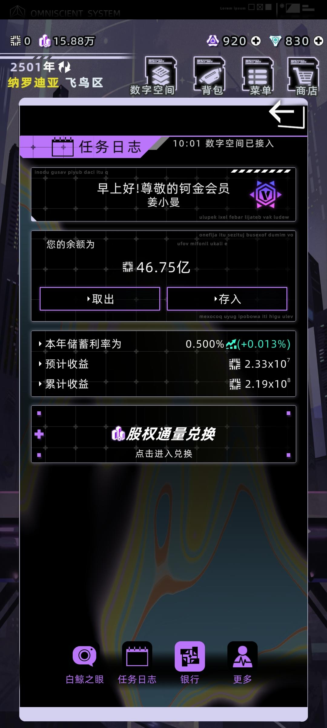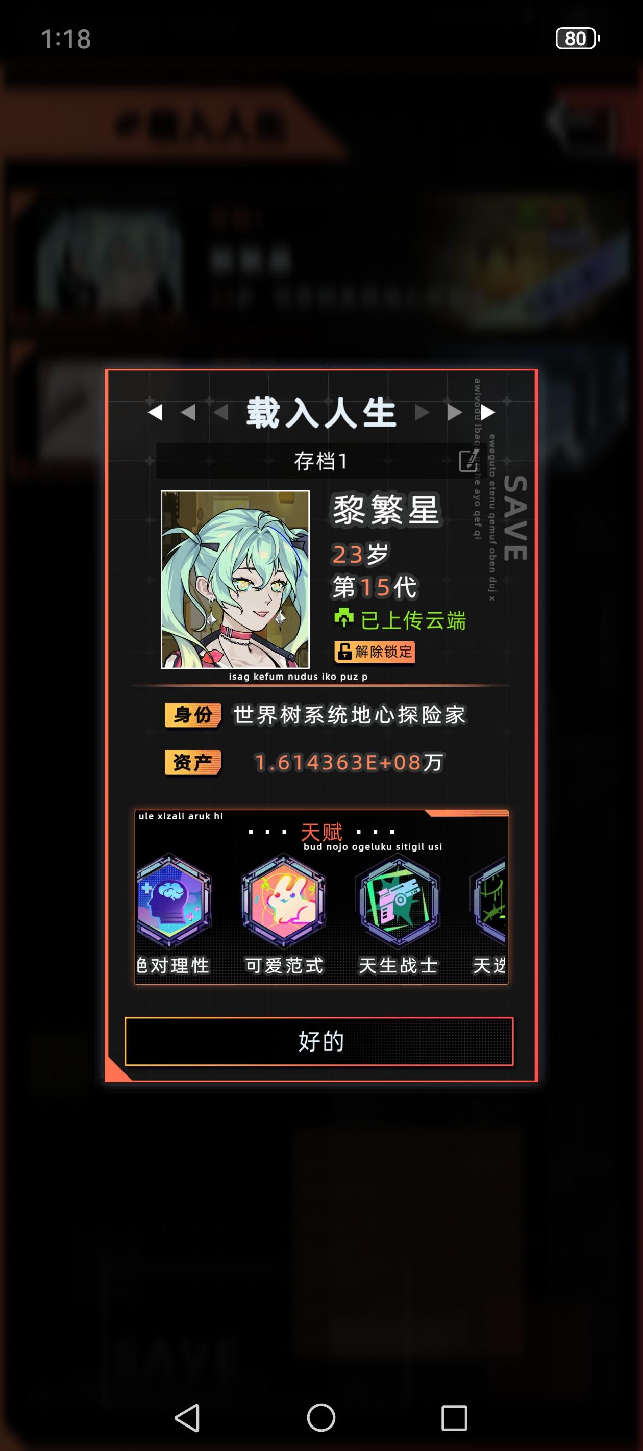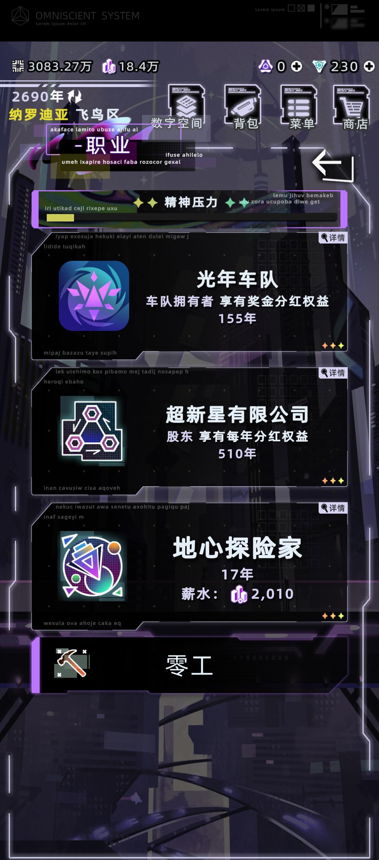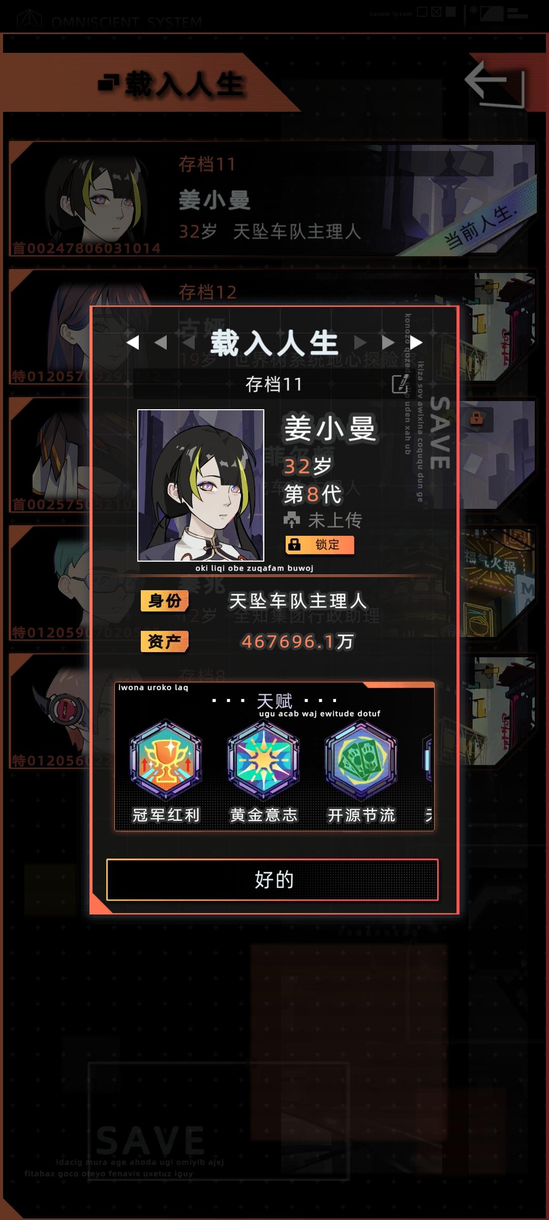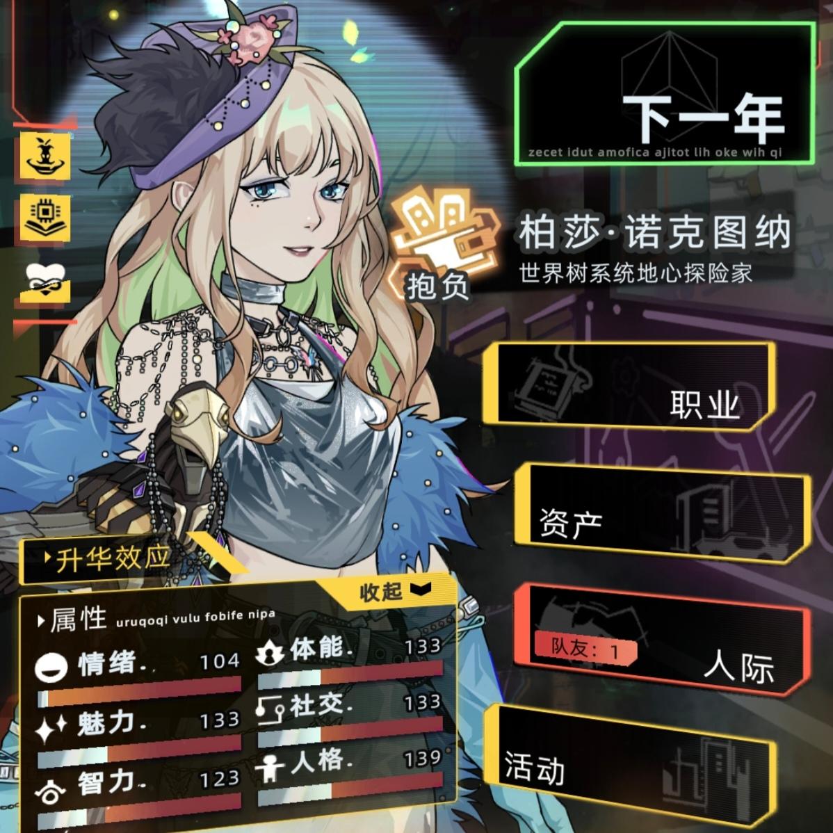 感觉之前那个攻略有点智障了,又优化了一下首先直接开始下一年,学习,学数字空间开发,结束中级学业,开始工作选项主要点理解力和熟练度,有点钱可以在资产设备中型买一个便携式工作站和全知辅助装置买一个脸部加熟练度的和颈部加理解力的,算法改进不用认真全消,改进先把可维护加到90,后面全加速度,这样每年都有不低的收入,在这个过程中可以收养一个孩子,他8岁带他去看数字骇客,只要有就看,保证在你死