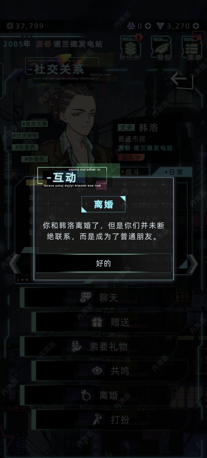 接上个帖子,哈哈哈哈,因为系统没有保存离婚失败 41岁那年,二妹也从小学毕业就读中学,我向韩先森提出了离婚,这是我最后关于他亲情维系的纽带(毕竟人物设定,子女18岁主动离家)他跟上次一样,依旧难受但毕竟是很好的战友关系,保持着前夫哥朋友牌。后面外出探险时候,遇到了一个女调酒师,我把她介绍给了前夫哥,他们很快结婚了,我盛装出席他的婚礼💒(不是)我也在执行任务中,接触了