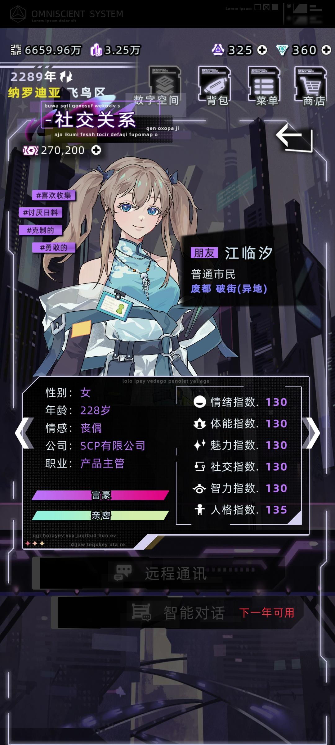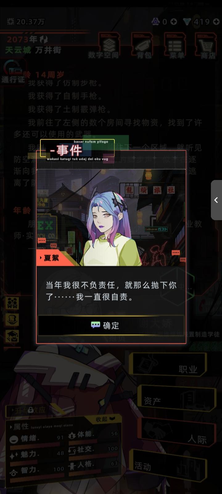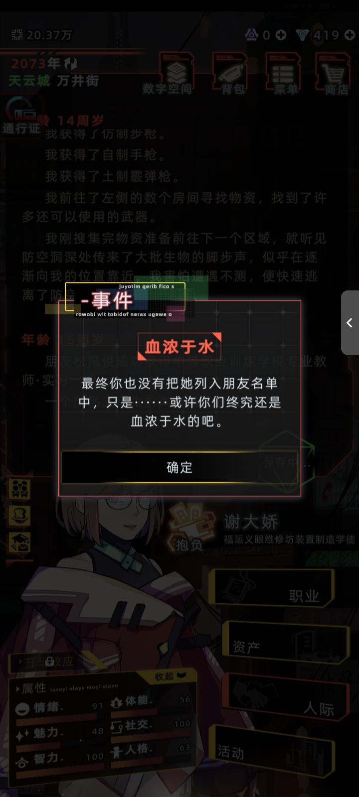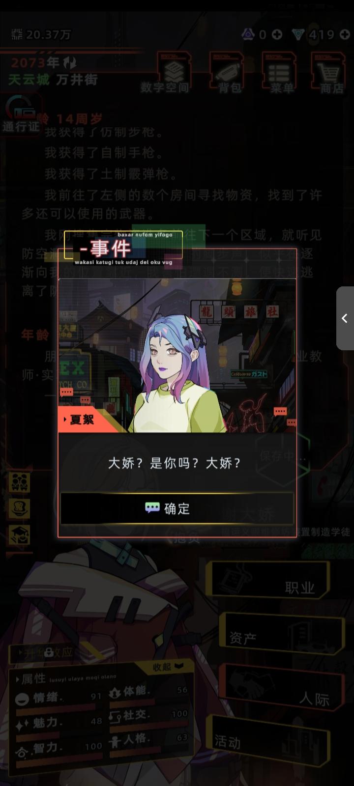 感觉之前那个攻略有点智障了,又优化了一下首先直接开始下一年,学习,学数字空间开发,结束中级学业,开始工作选项主要点理解力和熟练度,有点钱可以在资产设备中型买一个便携式工作站和全知辅助装置买一个脸部加熟练度的和颈部加理解力的,算法改进不用认真全消,改进先把可维护加到90,后面全加速度,这样每年都有不低的收入,在这个过程中可以收养一个孩子,他8岁带他去看数字骇客,只要有就看,保证在你死