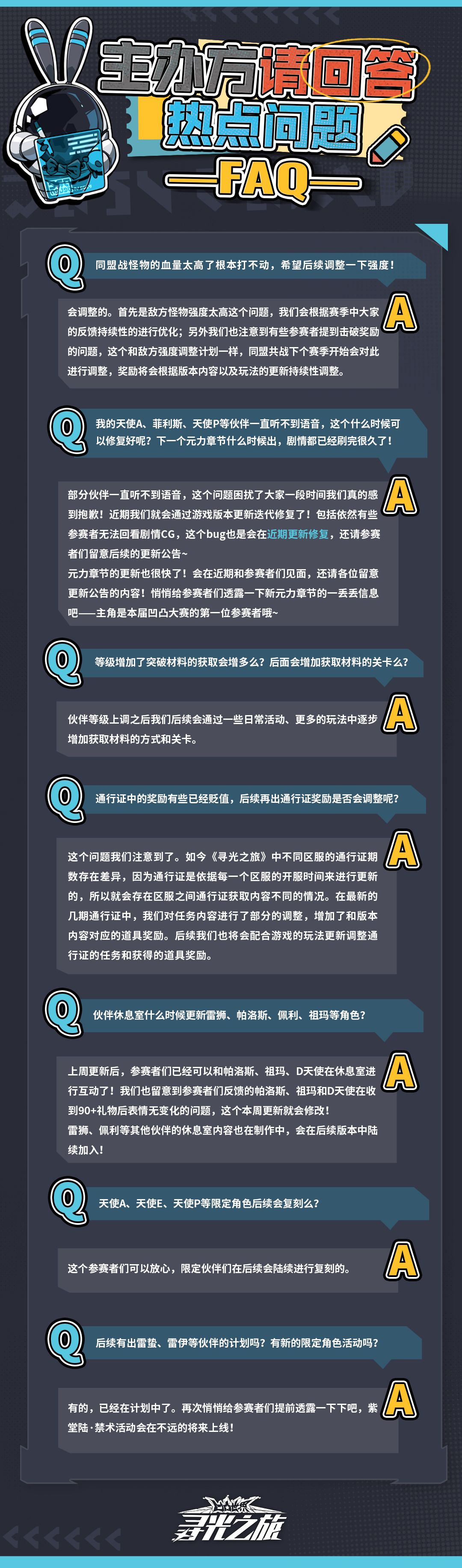 ▷主办方请回答-FAQ 新一期的主办方请回答出炉!同盟共战怪物强度太高、天使A菲利斯等伙伴听不到语音、下一章节元力剧情什么时候推出、限定角色后续是否会复刻等等反馈和疑问主办方作出了答复,一起来看看吧!