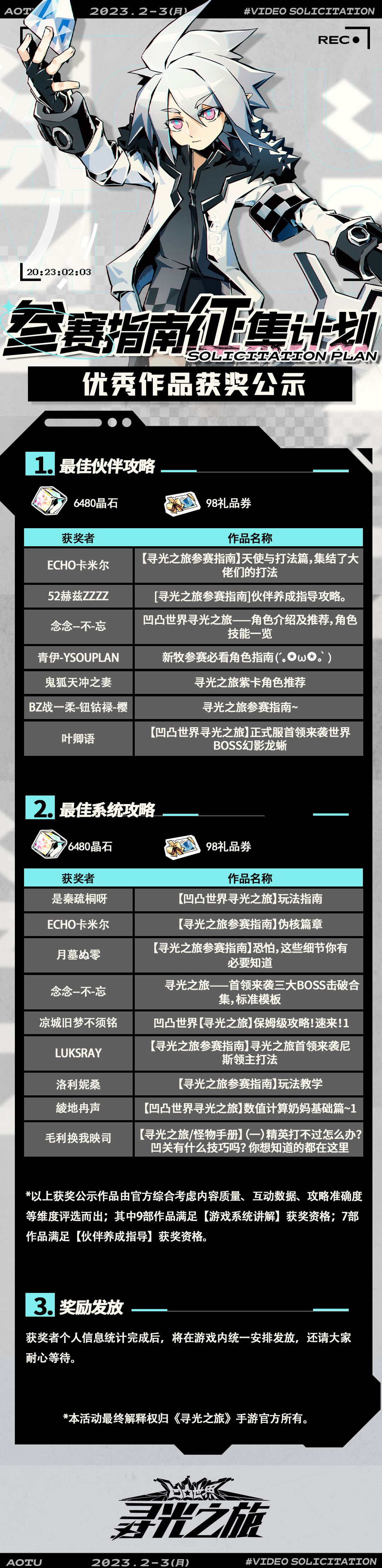 ⭐参赛指南征集计划⭐获奖名单新鲜出炉 本次「攻略视频征集活动」圆满落幕,感谢所有参赛者的精彩创作✧٩(ˊωˋ*)و✧ 经过多维度评估,以下优秀作品脱颖而出,详细获奖名单请点击下方长图查看,恭喜获奖的参赛者们~ ⭐以下参赛者将获得「6480晶石+98礼品券」 ⭐获奖参赛者还请前往哔哩哔哩私信官方账号@凹凸世界寻光之旅 提供游戏编号 ⭐奖励将在获奖者个人信息统计完成后在游戏内统一安排发放,还请大家耐心