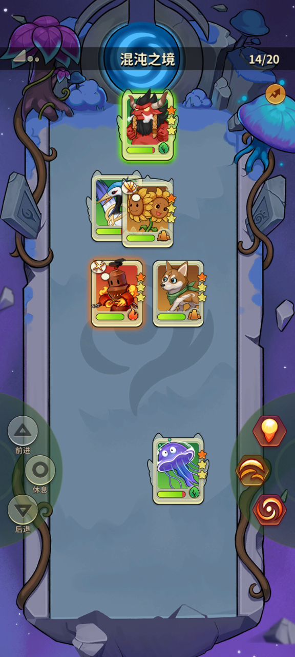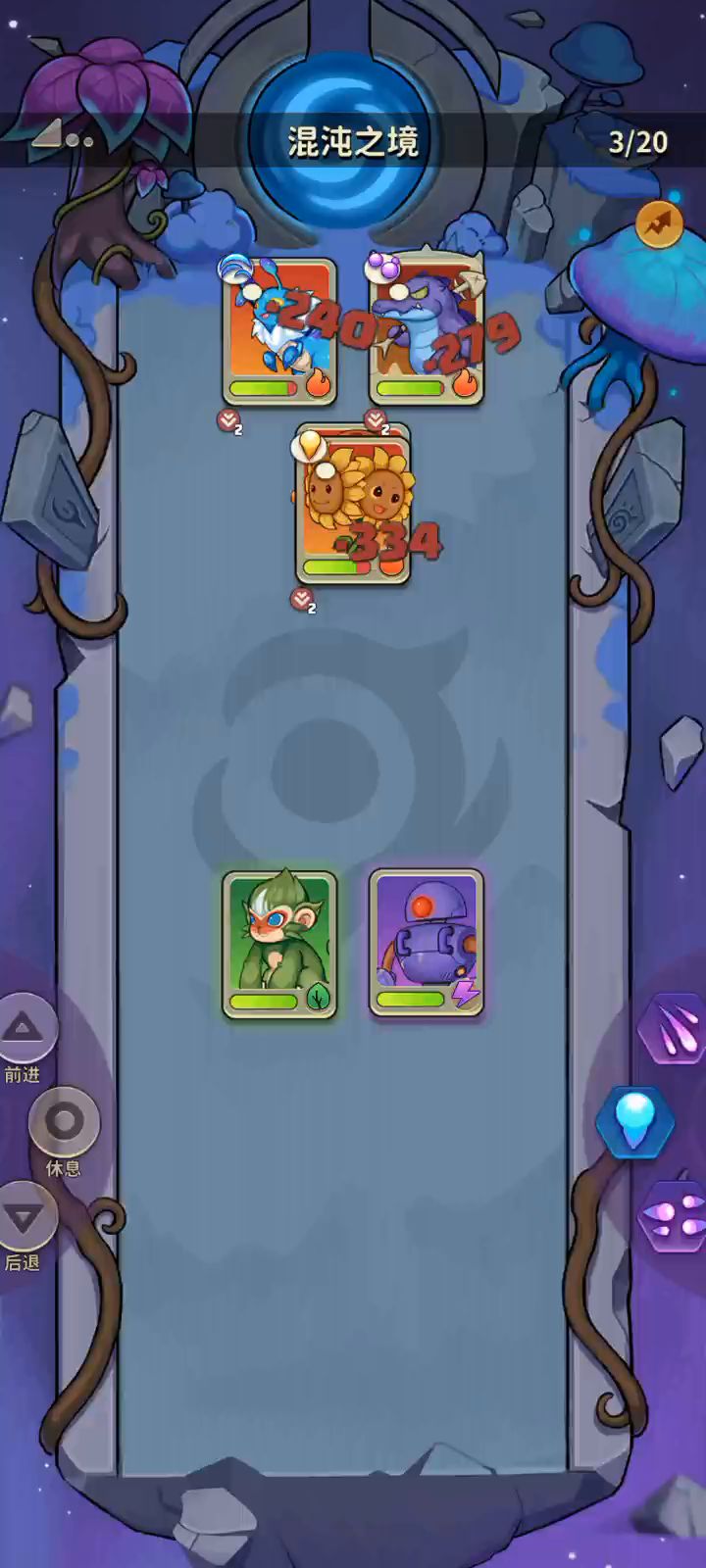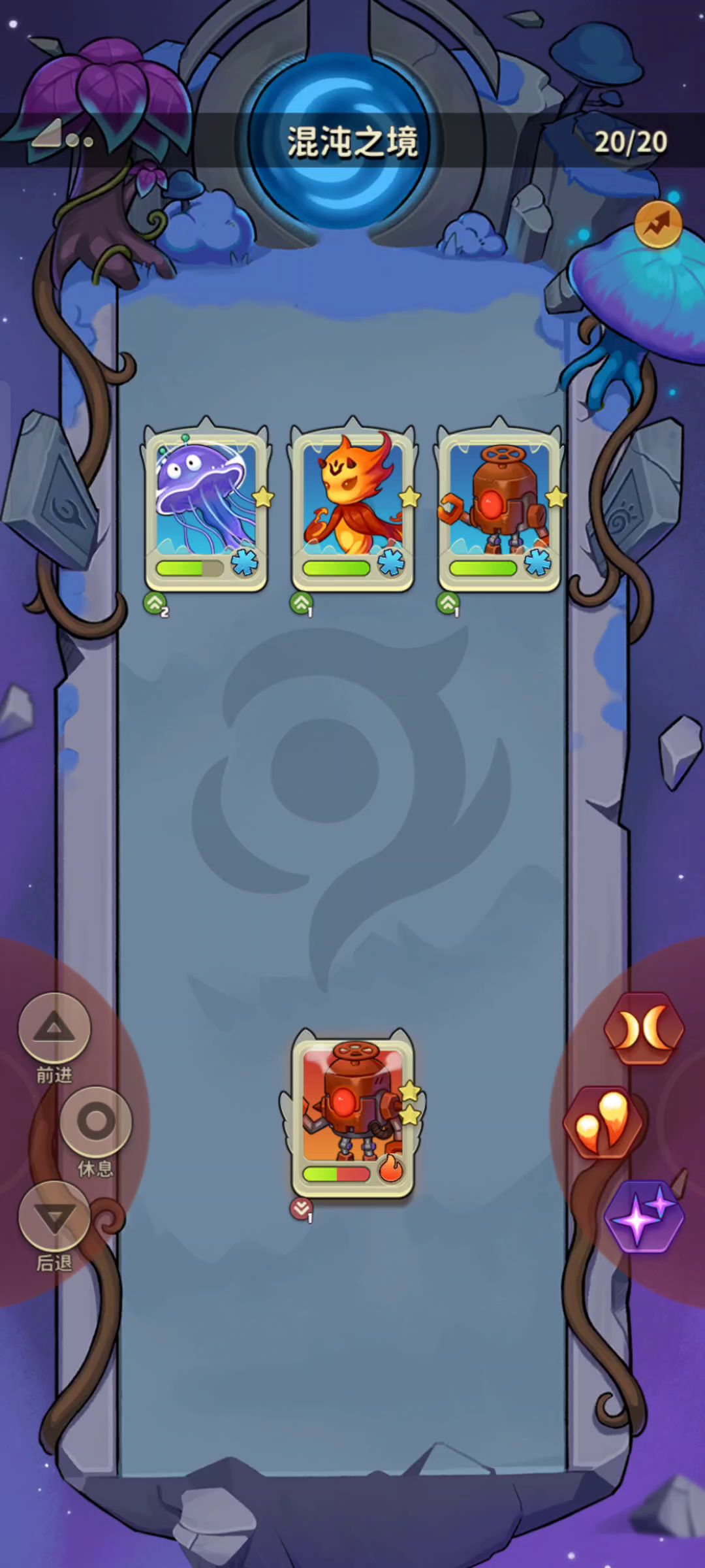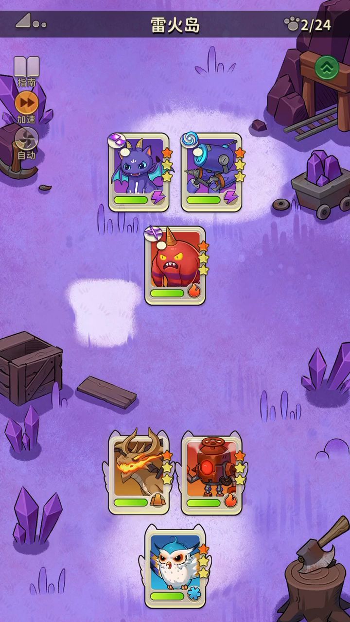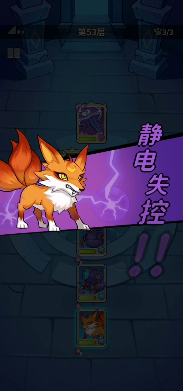狐狸增加暴击率,修理机给矿工禁锢挂冰,机器人冰系技能。 第二回合,原来的暴击率还留存着,再修理机器人挂雷,矿工打电属性的技能。 第三回合就又循环回第一回合的套路。