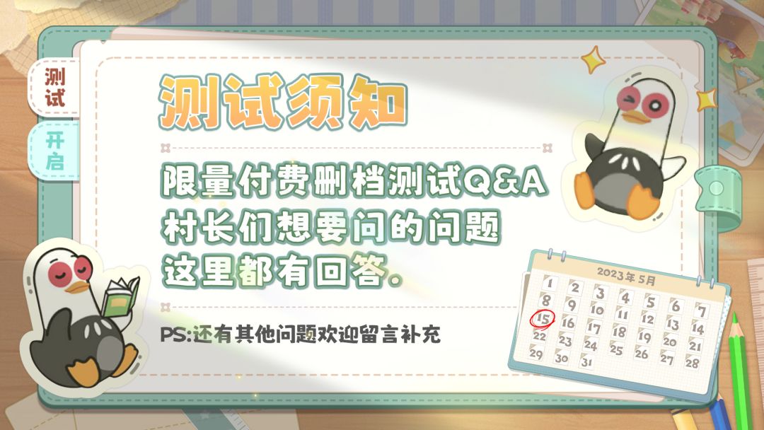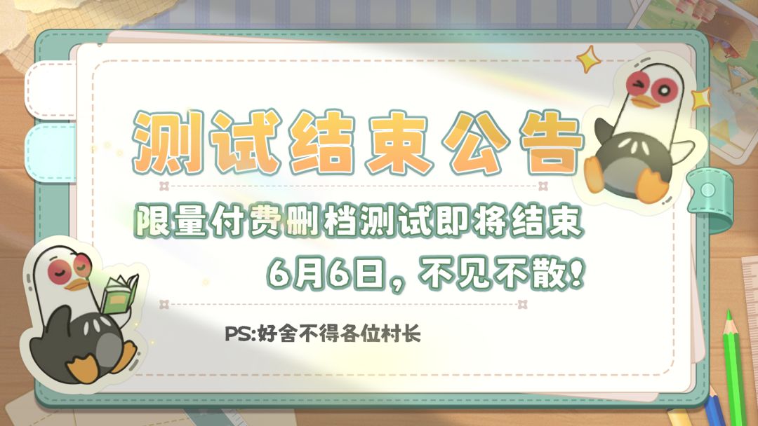 亲爱的村长: 《向往的生活》手游限量付费删档测试将于2023年5月22日(今天)23:59正式结束,届时我们将关闭服务器,并清除本次测试的全部游戏数据。 测试即将画上句号,在这为期8天的测试中,感谢村长们能与我们一起,挥洒汗水建设向往的小村,更要感谢各位村长对本次测试版本中不完善之处的理解与包容。 到了暂时说再见的时候了,《向往的生活》手游的优化仍在继续,本次的版本也不会是最终的版本。在这短短的8