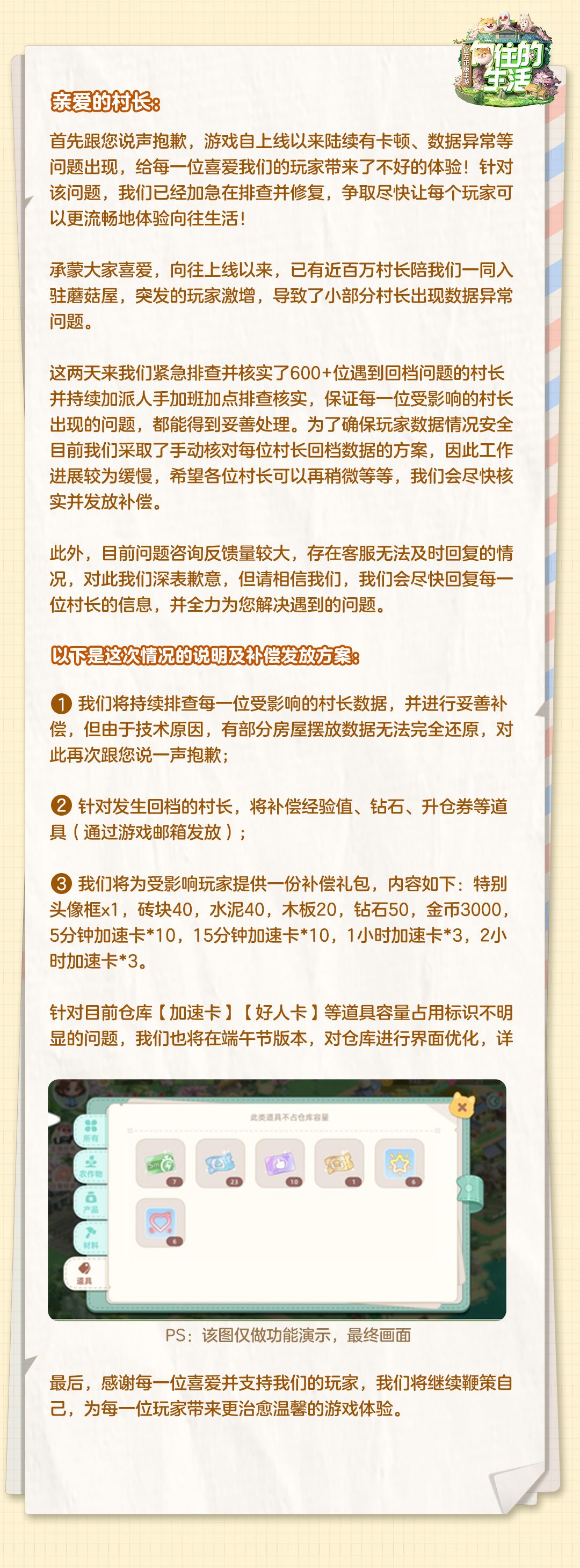 亲爱的村长: 这里是《向往的生活》手游运营团队。 目前接报,在停服更新完成后,游戏中有部分村长出现数据回档的问题。 我们衷心为各位受影响的村长道歉。给大家带来诸多不便,我们理解大家的失望和焦虑。 技术团队自问题出现以来一直加班加点修复,但遗憾的是,问题尚未完全解决。请相信,我们将竭尽全力以期尽快恢复游戏正常运行。 为表达歉意,我们将先为全服玩家提供补偿: 升仓券*2、1小时加速卡*5、装货券*