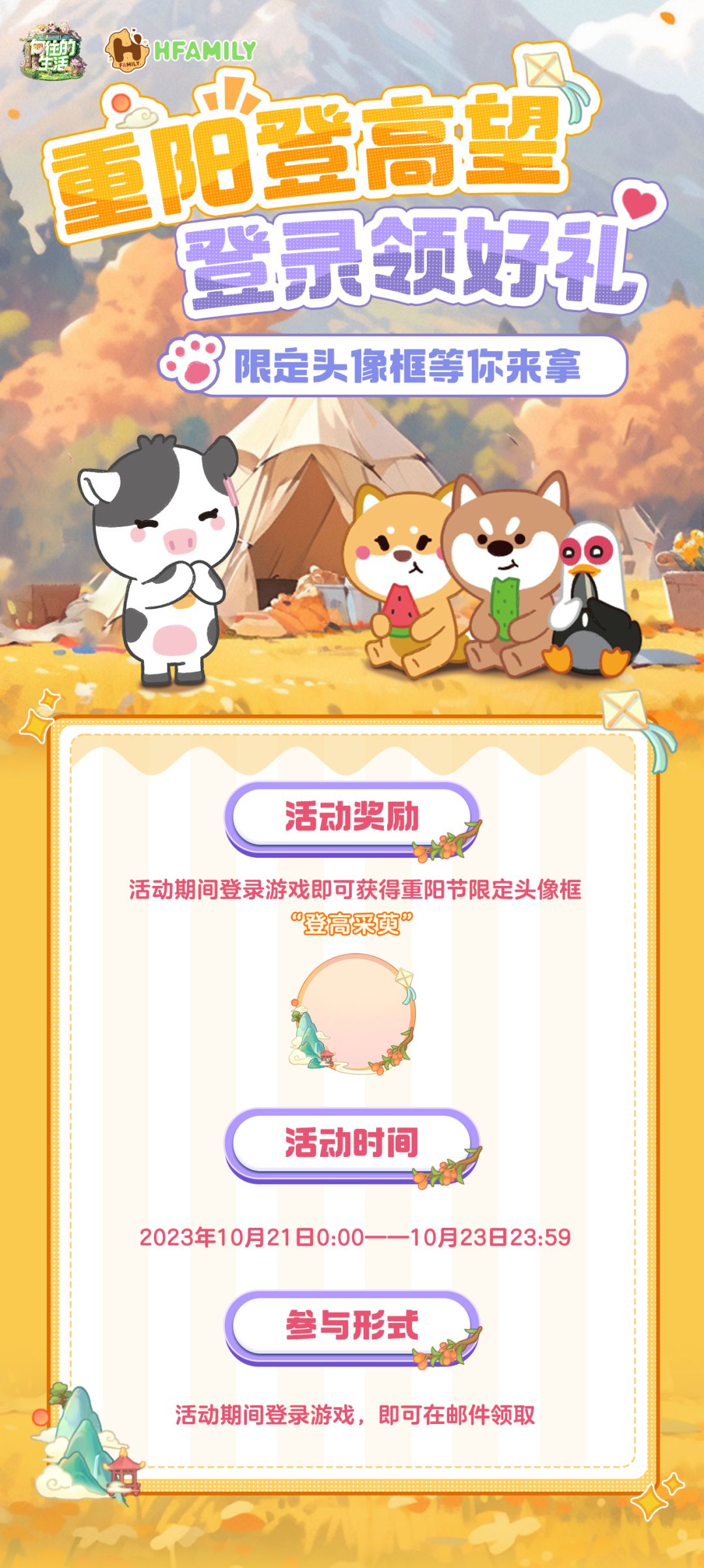 亲爱的村长: 重阳佳节将至,愿每一位村长如意安康,特给村长们准备了重阳节限定头像框~ 活动内容请看下面详细说明吧! 【活动时间】2023年10月21日0:00——2023年10月23日23:59 【参与方式】登录游戏即可参与 【活动奖励】在活动期间登录游戏,即可领取重阳节限定头像框“登高采萸”。头像框将通过游戏内的邮件发放。 各位村长记得来领!!