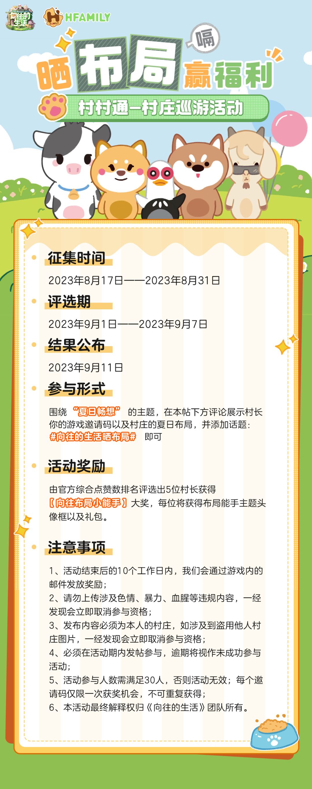亲爱的村长: 晒布局赢福利活动强势来袭! 8月17日-8月31日,围绕“夏日畅想”主题,村长们可在渠道论坛或小红书“向往葵花籽”的活动帖中评论展示村庄的夏日布局,将由官方综合点赞数排名在每个活动帖评选出5位村长获得【向往布局小能手】大奖,每位可获得布局能手主题头像框以及礼包奖励,详情请村长们移步查看下方的活动详情~