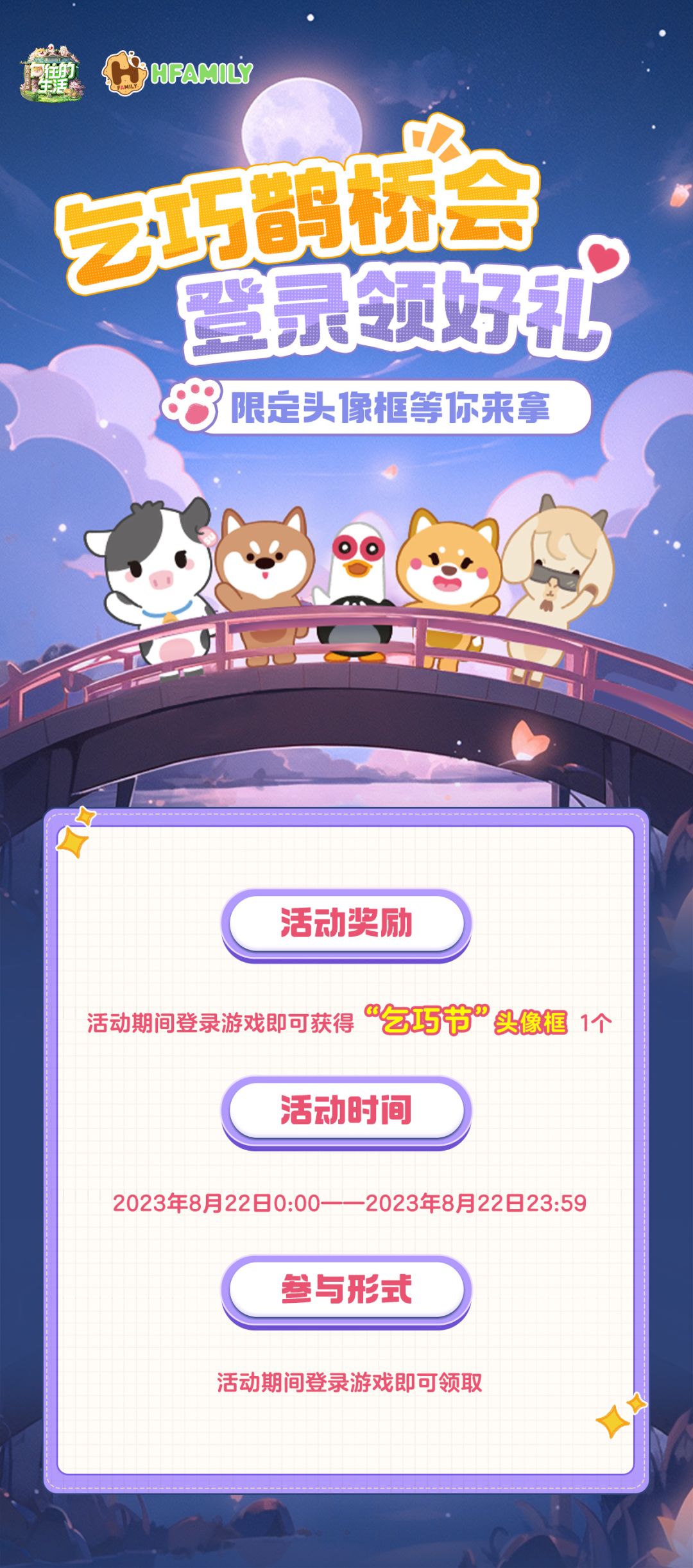 亲爱的村长: 碧梧初出,桂花才吐,池上水花微谢。为迎接乞巧节,我们为村长们准备了乞巧节限定头像框! 活动内容请看下面详细说明! 【活动时间】2023年8月22日0:00——2023年8月22日23:59 【参与方式】登录游戏即可参与 【活动奖励】在活动期间登录游戏,即可领取限定头像框“七夕星愿”。头像框将通过游戏内的邮件发放。