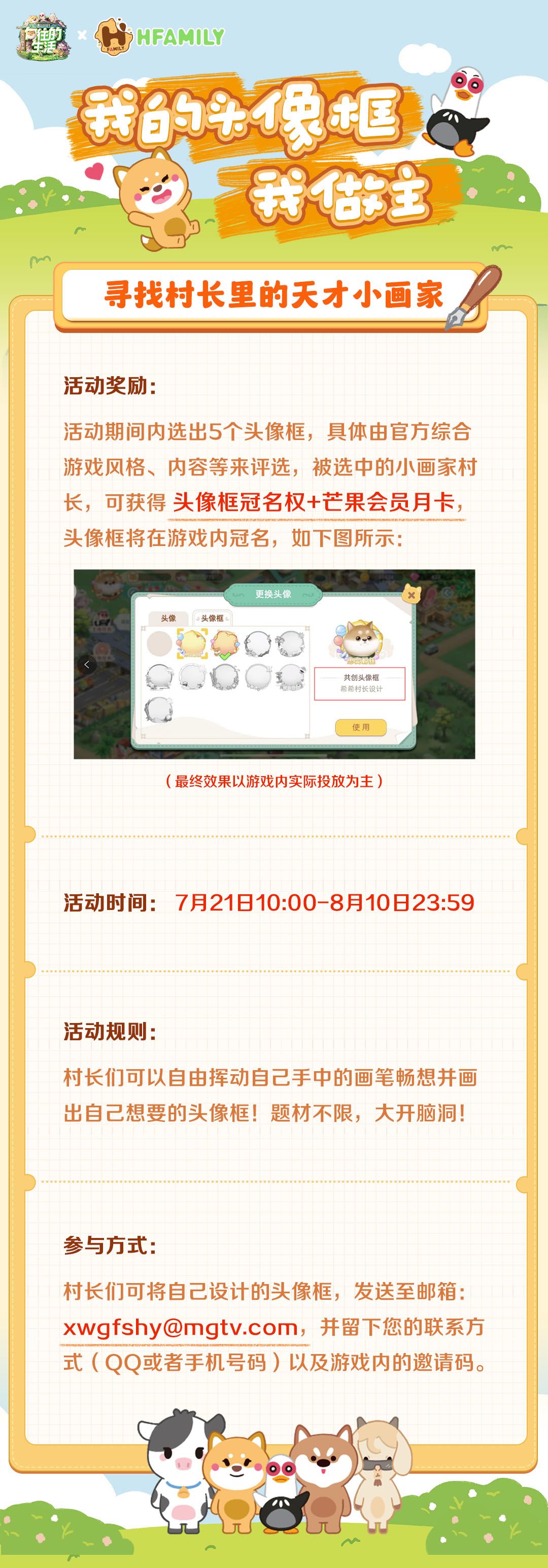 亲爱的村长: 本次【我的头像框我做主】活动已结束!感谢村长们热情的参与!经过我们综合的评选,特此选出下面5个头像框: 我们将根据上述头像框创意进行一定的修改调整,预计将于9月下旬陆续在游戏内冠名展示,敬请期待~ 同时,本次入选我们头像框的村长们还会获得芒果会员月卡的奖励,我们于8月18日前发放,烦请村长留意提交头像框时的邮箱及时查收~ 下次活动期待各位村长的继续参与,共同建设繁荣村