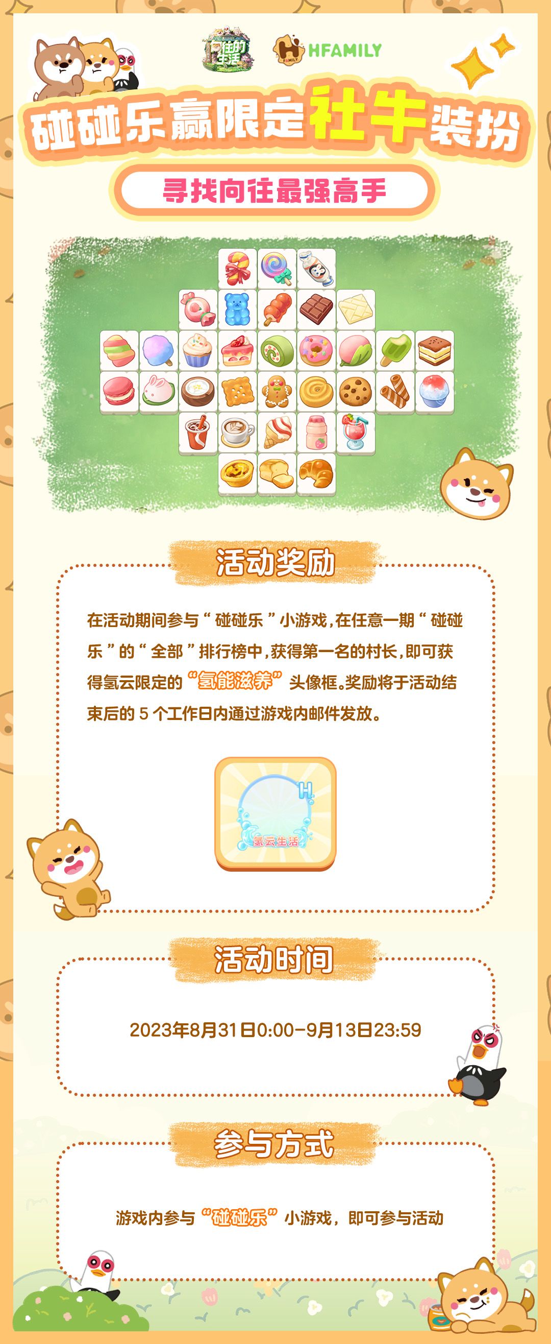 紧急播报,“寻找最强游戏高手”特别活动再次即将来袭!我们将为游戏力超群的村长们准备了特别的纪念头像框作为奖励! 【活动时间】2023年8月31日0:00-9月13日23:59 【参与方式】游戏内参与“碰碰乐”小游戏,即可参与活动 【活动奖励】在活动期间参与“碰碰乐”小游戏,在任意一期“碰碰乐”的“全部”排行榜中,获得第一名的村长,即可获得氢云限定的“氢能滋养”头像框。奖励将于活动结束后的5个工作日