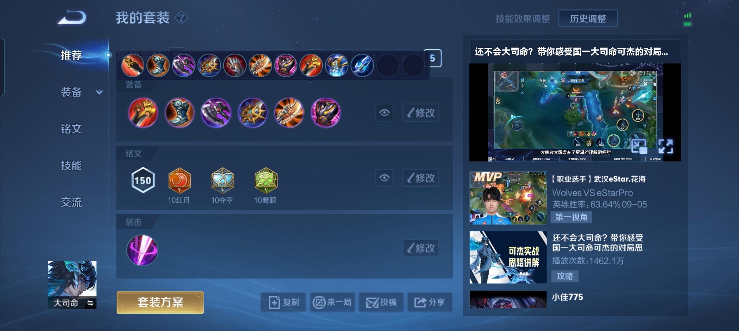鲁班:布甲鞋,影刃,无尽,不详前面那个210物防的小件,逐风,不详,破晓 (铭文:祸源夺翠鹰眼)(鲁班本身就是小短腿,如果辅助再是软辅的话那就更惨了,这个出装主要是在尽量保证输出的情况下加点血量和物防,防战士突脸,最重要的攻速会叠加到上限的200,一秒能A2~3下,这可比靠技能之后的扫射靠谱多了。法师就没办法了,但是法师大部分也都是脆皮,拼一个互相伤害看谁死的快 大司命:小打野刀,布甲鞋,影刃,充