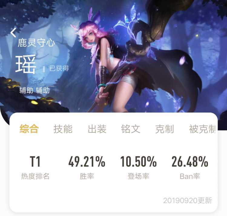 呦吼大家好,这里是不务正业不做游戏推荐的小手。今天为大家带来一期鹿灵少女阿瑶的攻略,来带大家看看混子的上分心得。 本人段位目前王者20星,本来主玩上官婉儿,然而常年被ban做板凳导致我不得不练一个新的英雄,就这样开始了我的混子之路。 一、英雄介绍。 阿瑶是一个机制非常特殊的软控类辅助英雄,1技能拥有团控和点控,时间不长但是足以打断钟馗大招等敌方关键技能。2技能本身输出不高,不能起到提升打野速率