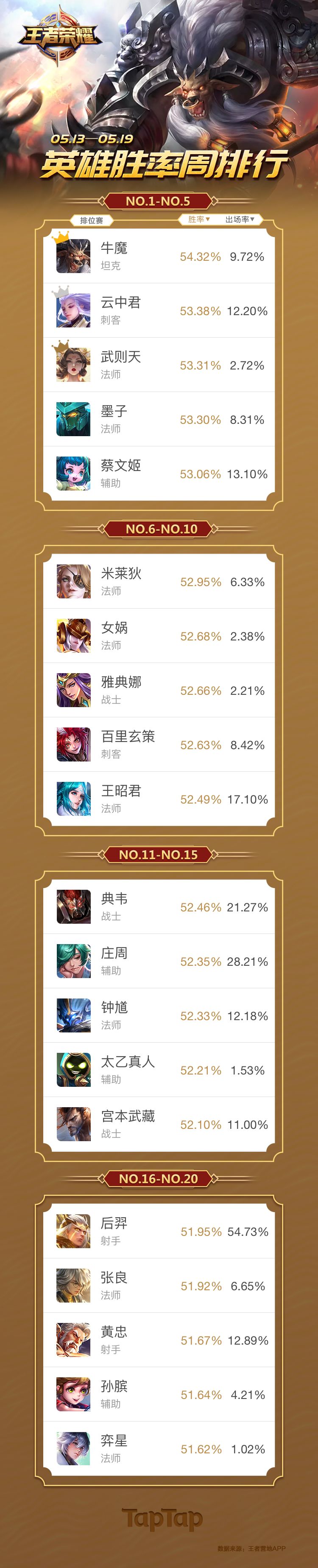 《王者荣耀》英雄排位胜率周排行(5.13~5.19):云中君成刺客王牌