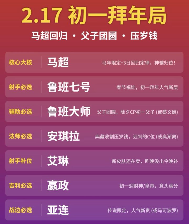 明天大年初一,咱们继续!🐉 2.17 大年初一·七星全明星阵容:1. 马超(核心必选·大核)理由: 马年限定+三日回归定律。 昨晚的马年双美谢幕后,神骥系列的大旗必须由马超扛起来。时间间隔完美符合算法。2. 鲁班七号(核心必选·射手)理由: 春节福娃+国民射手。 大年初一谁不想看到蹦蹦跳跳的小卤蛋?人气绝对断层,必选!3. 鲁班大师(核心必选·辅助)理由: 父子团圆+羁绊逻辑。 既然