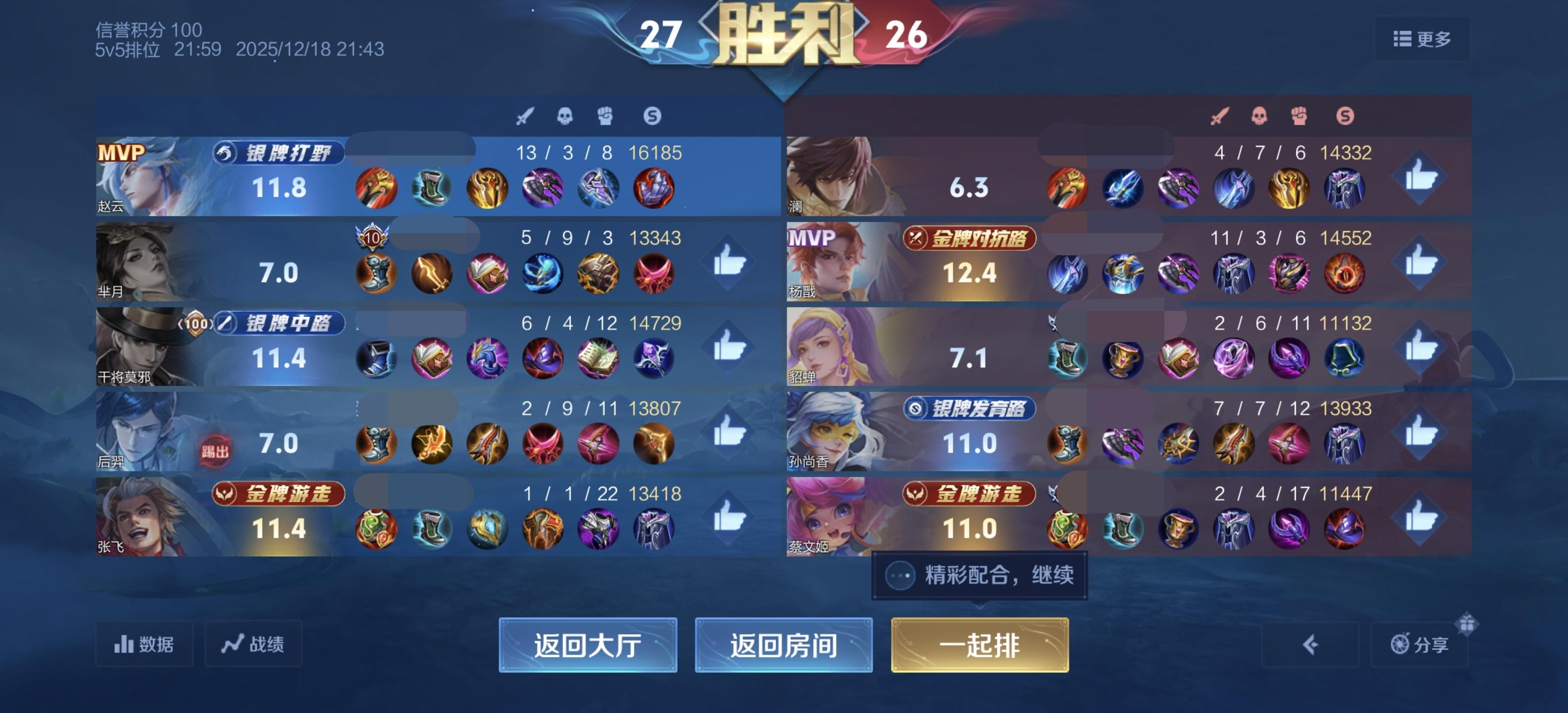 前期上下路直接被平推,还好高地没掉,前期我抓人的速度勉强能跟上队友掉点的速度。还好我这边干将伤害起来了,张飞也能抗,我也能抗能输出,芈月前期也乱送,后期听劝带线去了,后羿全程提款机。对面呢,就是杨戬有东西,其他没有特别强的,如果对面打野再有手法那这局基本就是必输局,更本没有后期。后羿被踢出对局,拿了一张保护卡,那后面就基本是必输局了,可以歇一段时间了