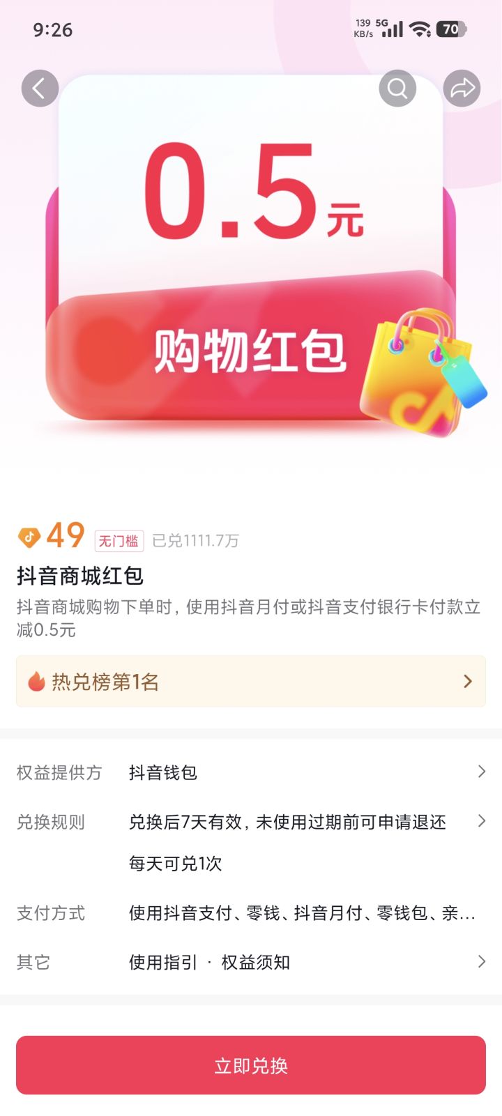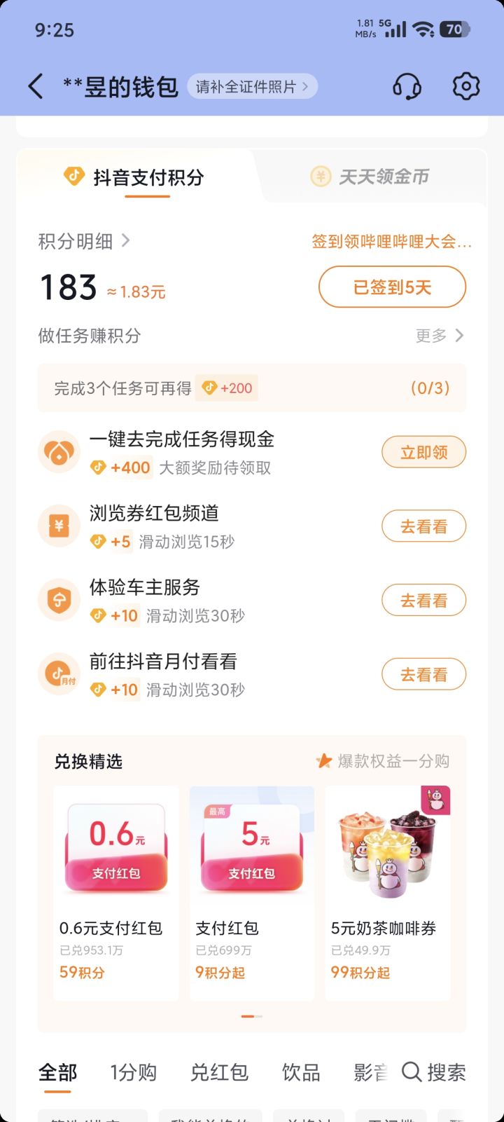 春节限定马年皮肤上线,传说品质仅59元,搭配好运卡需77元。但利用抖音积分+双平台提现,实际花费竟能压到14.63元!每天动动手指,39天白嫖两个Q币,成本不到两毛一个。这份全网最狠攻略,让你薅哭腾讯。核心操作三步走1. 抖音积分换红包打开抖音「我的」→「钱包」→「支付积分」,每天完成浏览任务,攒够49和59积分,分别兑换0.5元购物红包和0.6元支付红包。注意:兑换后立刻点「去使用」,自动