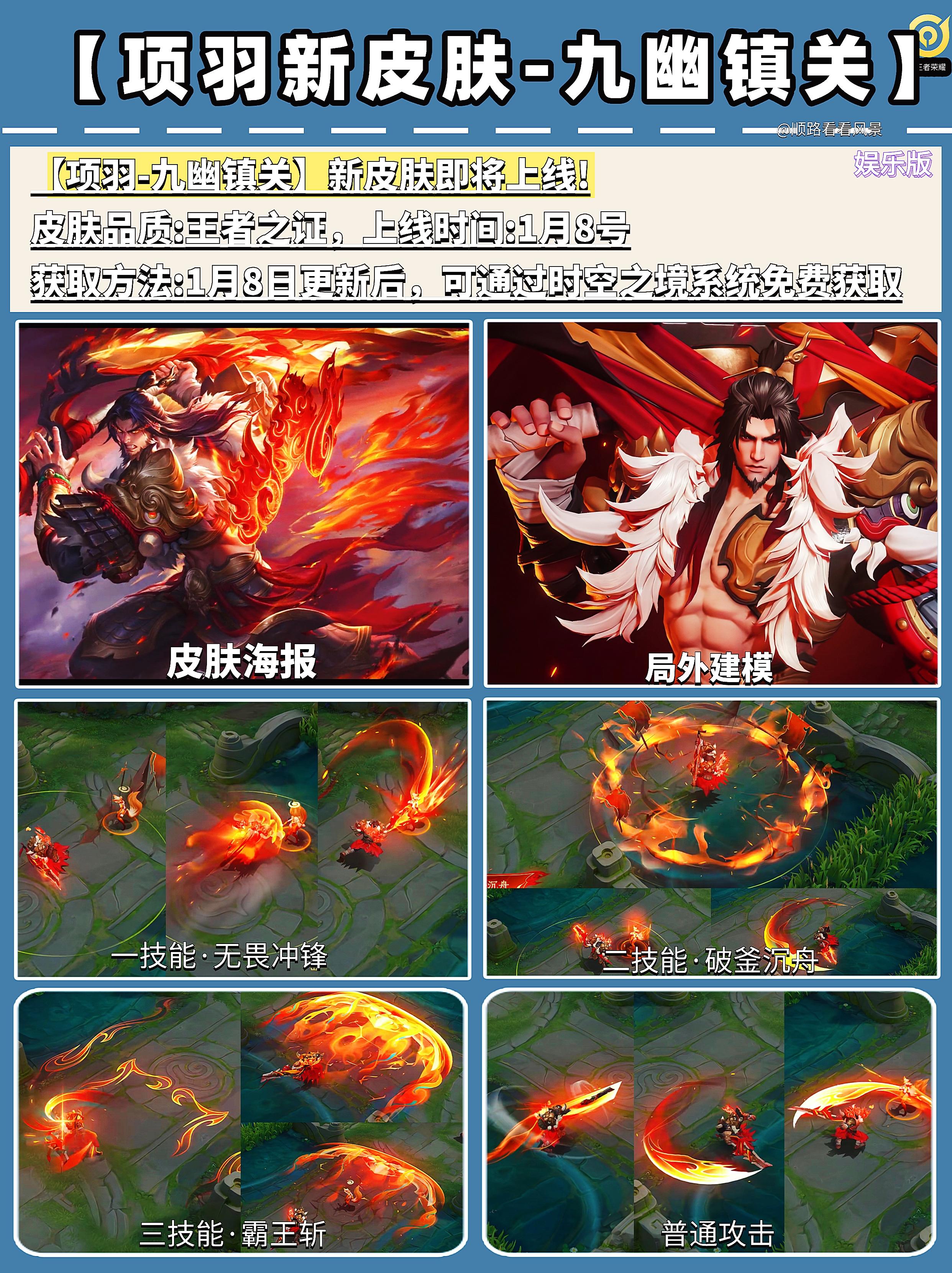 项羽免费新皮肤来咯,惯例早知道就上王者了~问题来了,对于打不上王者段位的玩家怎么办?大家不用担心,可以等以后技术慢慢提升再充能哈~【角色设计】整体设计以塑造一位“镇关守将”为核心,将中式古风铠甲与玄幻元素进行融合,突出其苍劲坚韧的质感。深色长发高束成发髻,搭配散落的鬓发与络腮胡,尽显其粗犷不羁的武将气质。黑红金主色调铠甲搭配金色纹饰厚重而炽烈,其肩甲为威严瑞兽,白色兽毛随动作飞扬,在肃