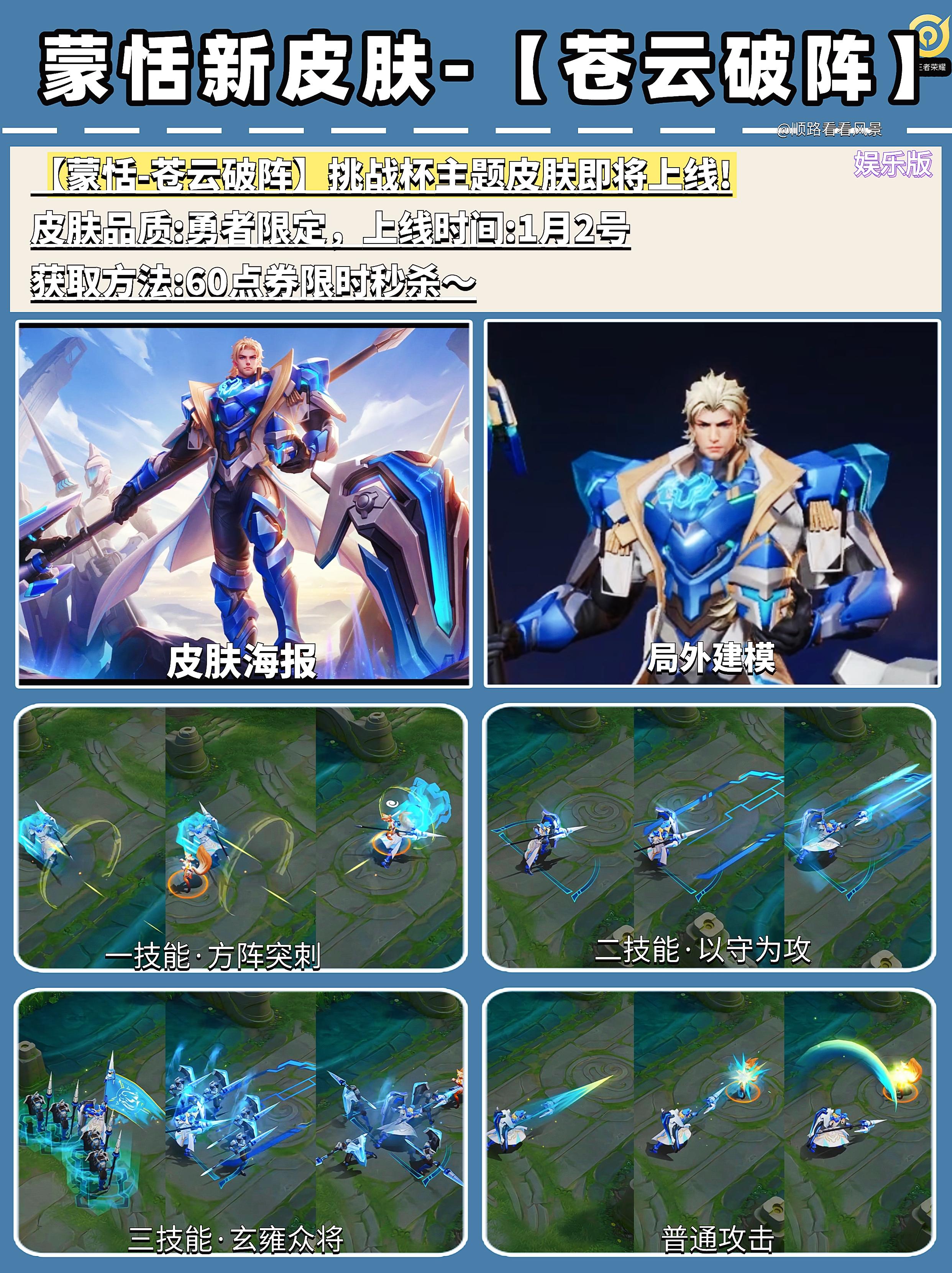 哇,小王突然爆料多款新皮肤啦,蒙恬新皮肤首周秒杀60点券,品质为勇者限定皮肤~建议喜欢玩蒙恬和喜欢收藏皮肤的小伙伴就别错过了。2025挑战者杯主题皮肤【蒙恬-苍云破阵】即将上线!作为未来战场的统帅,我们将“装甲”与“制服”进行深度融合,突出蒙恬作为未来将领的使命感与科技感。主体采用蓝色与纯白的经典对比,营造冷峻科技感;金色镶边作为辅助色,强调其作为统帅的尊贵身份。1月2日0点开启60点