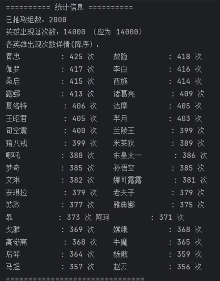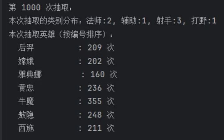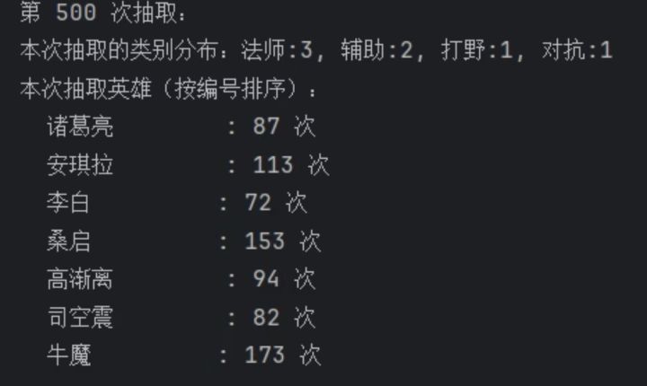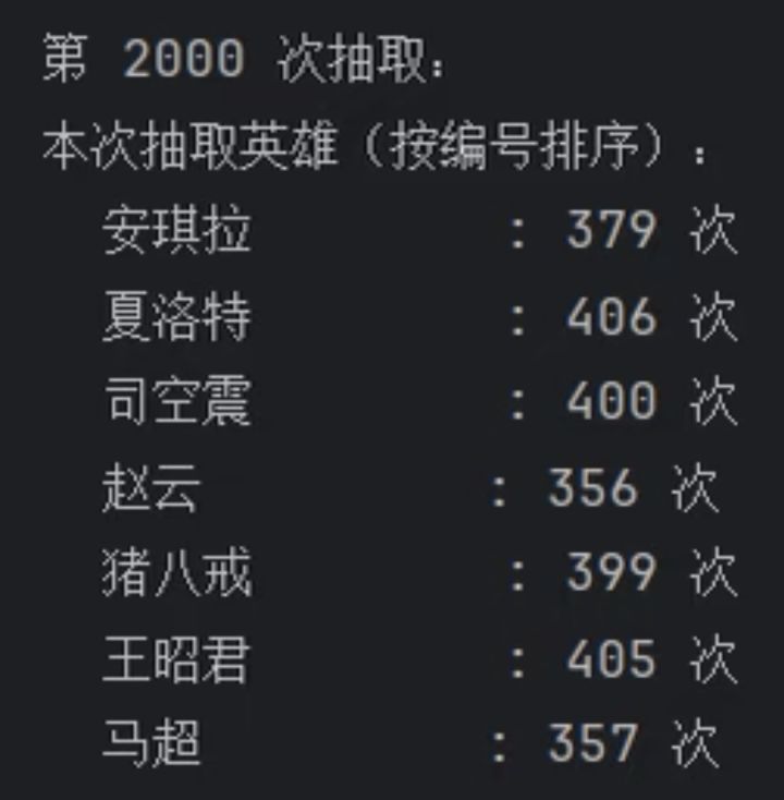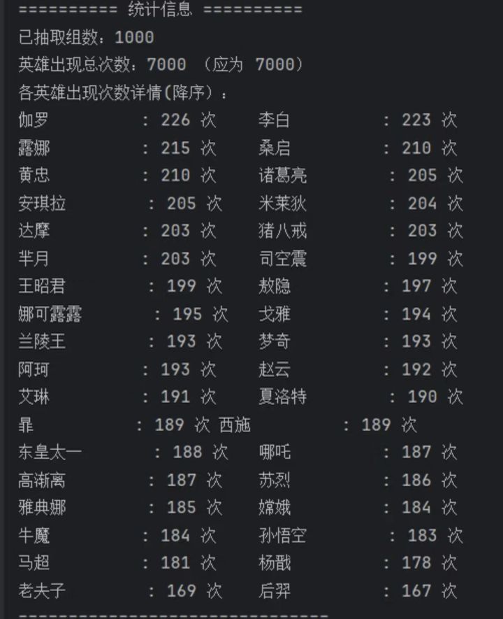 2.19王者赛马随机算法抽取结果这个就是用Java编的一段最最简单的随机抽取的代码,没有加任何条件,36个英雄选7个一共有8347680种组合,这个就只用算法随机抽了1000次这些抽取结果大家就当参考就行,没把握能中P2,P3为第一种,还是按照以前一样随机抽取7个P4,P5是第二种,按照分路以及3211随机抽取的P6是统计的2.19日36名英雄在前几天中奖情况最后一张是主播本人的选的,