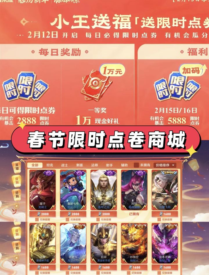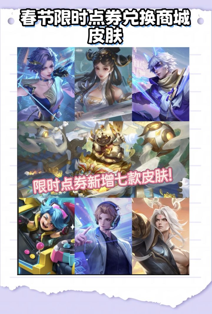 王者荣耀马年限时点券商城上新!新增7款皮肤免费兑王者荣耀马年限时点券商城重磅回归,不仅返场多款人气皮肤,还新增了7款全新皮肤供玩家兑换。这次活动力度超大,上线就送666限时点券,做任务轻松白嫖上千点券!新增皮肤一览本次商城新增皮肤阵容豪华,包含:太乙真人-瓦猫非猫(首款史诗皮肤,710限时点券)东皇太一-灼幽烈阳百里守约/镜-真我赫兹刘禅-电玩爆裂旋风张良-千筹问战大乔-白蛇限