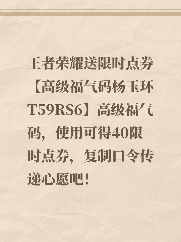 王者荣耀送限时点券【高级福气码杨玉环T59RS6】高级福气码,使用可得40限时点券,复制口令传递心愿吧!
