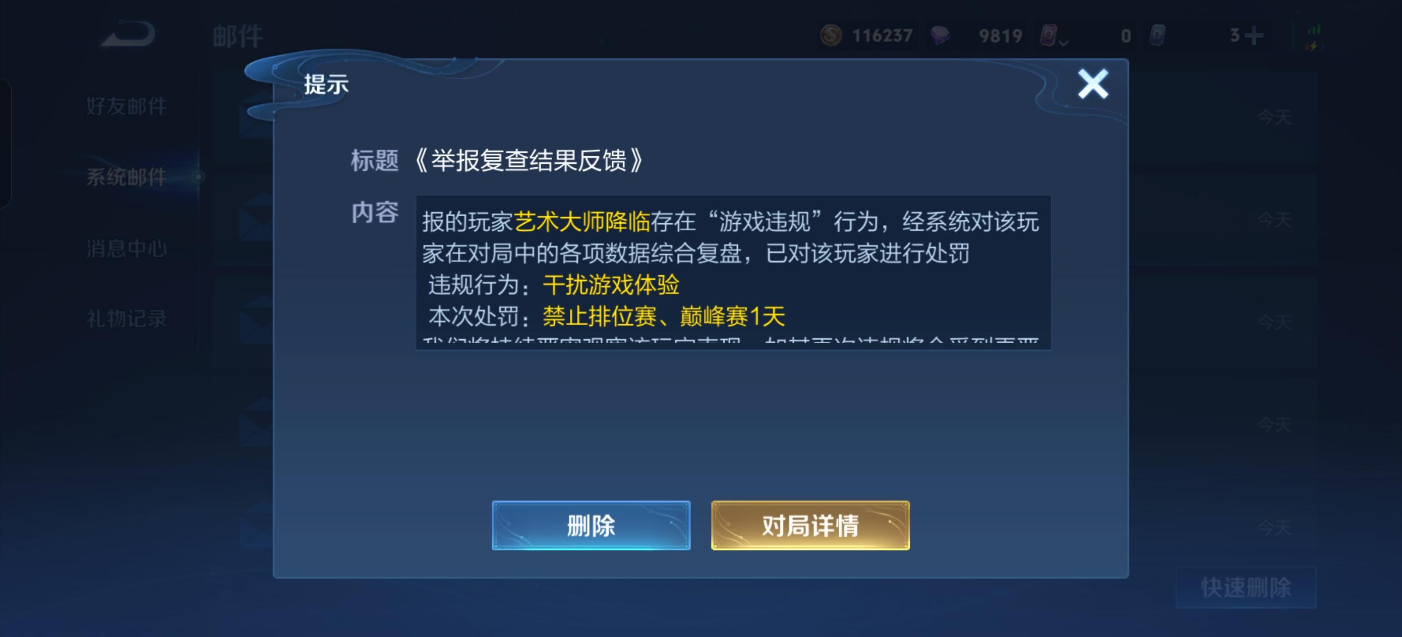 打把巅峰赛,这个镜不出打野刀,一直摆,不仅没有被踢出对局,第一次举报还不扣信誉分,这还是之后给我反馈的,不得不说王者真是个好玩的游戏。。。