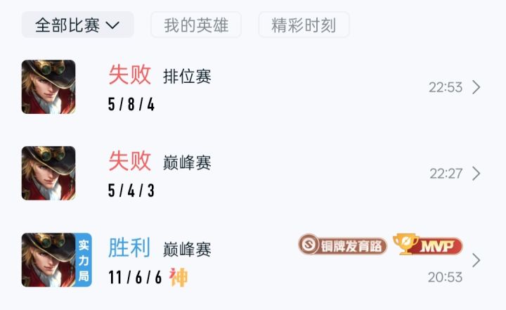 从下往上说第一把,我就有一波糖了,不知道是断触了还是怎么站原地不动空放个眩晕,被公孙离打s了,就糖那一下就叫我可菠萝,最后我还是MVP,别人都没说啥就那个中单小乔,真不是我对这个英雄有啥看法,之前也是,我马可前期逆风没电刀没末世哪来的伤害?小乔死了就怪我不转大,我那不是贴脸上送吗第二把,大司命在发育路跟孙尚香单挑,我想过去支援,他发个撤退,我寻思他能打的过想单吃线我就走了,结果他被孙尚香丝血反