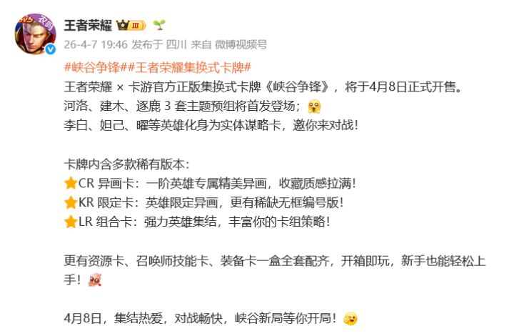 🎴 王者荣耀携手卡游,推出实体卡牌《峡谷争锋》 由腾讯旗下天美工作室群开发的国民级MOBA手游《王者荣耀》近日再次引发网友讨论据悉王者荣耀近日宣布将于卡游展开合作,推出实体卡牌《峡谷争锋》卡游是国内集换式卡牌领域的龙头企业,2024年收入突破百亿元,市场份额超七成 两者联手打造的官方正版集换式卡牌《峡谷争锋》于4月8日正式开售,卡牌内含CR异画卡、KR限定卡、LR组合卡等多种稀有版本,众