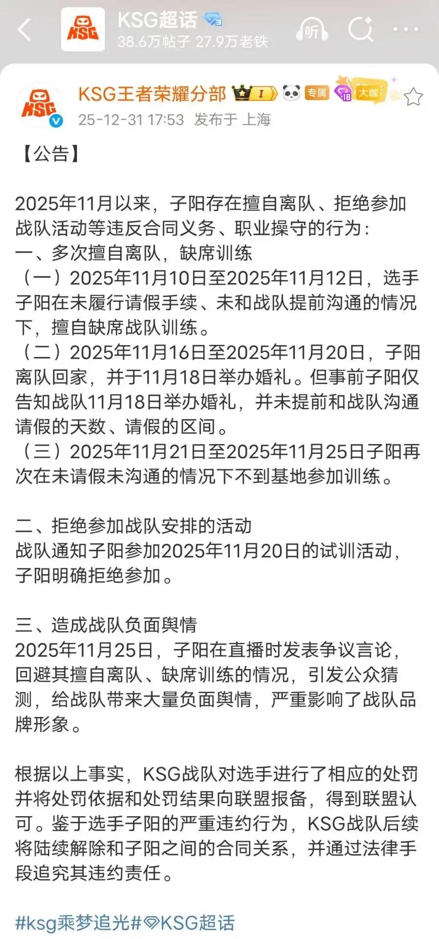 👑子阳被光速解约 腾讯旗下国民级社交moba手游《王者荣耀》已于近日引发网友热议原因系KPL电竞圈在年底爆出大新闻!据悉苏州KSG战队于12月30日正式发布公告,宣布将解除与冠军辅助选手子阳的合同,并追究其违约责任相关信息引发热议 👑王者荣耀选手身败名裂!这位手握6个冠军、曾是游走位FMVP的明星选手,职业生涯突遭重大变故。根据KSG的公告,解约决定源于子阳自2025年11月以来的一系列