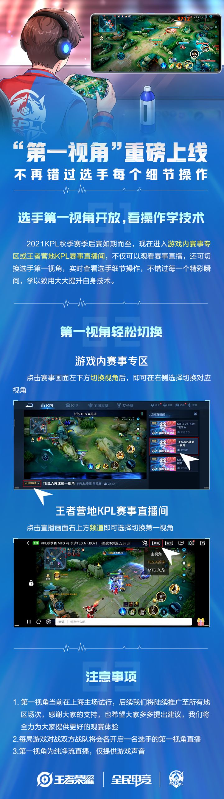 今日起2021KPL秋季赛季后赛正式开打,游戏内和王者营地同步推出KPL选手第一视角,小伙伴们在观看赛事直播的同时,还可切换选手第一视角,实时查看选手细节操作,不错过每个精彩瞬间!【观看方式】游戏内赛事专区:点击赛事画面左下方“切换视角”后,即可在右侧选择切换第一视角王者营地KPL赛事直播间:点击直播画面右上方“频道”即可选择切换第一视角【注意事项】第一视角当前在上海主场试行,后续将陆续